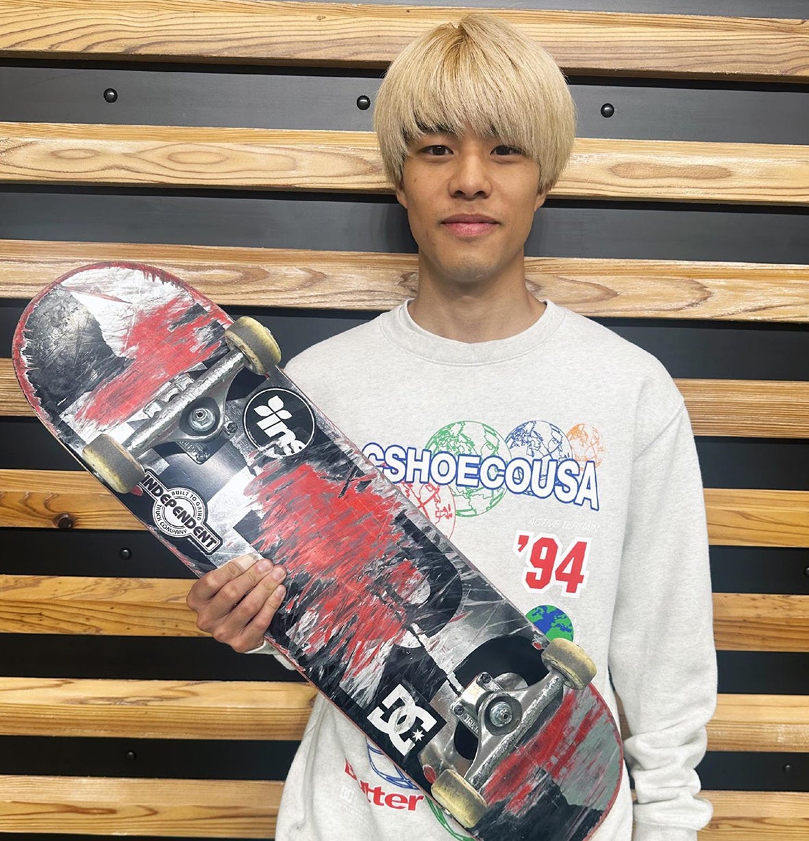 7歳からスケートボードを始め、切れ味鋭いヒール系トリックと金髪がトレードマークの静岡県出身の20歳。