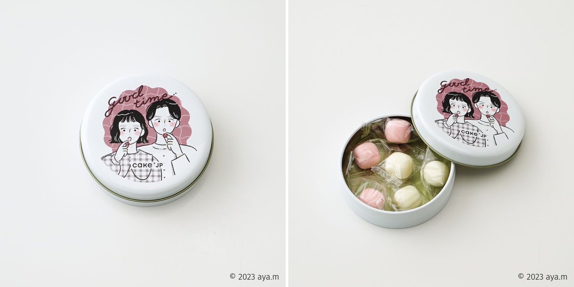 キャンディを食べているカップルをシンプルに表現したデザインがレトロでキュート!甘酸っぱいイチゴミルク味と濃厚なミルク味、2種のフレーバーのキャンディを楽しめます。今回のために描き下ろしていただいたデザインの缶は、小物入れにもぴったり!