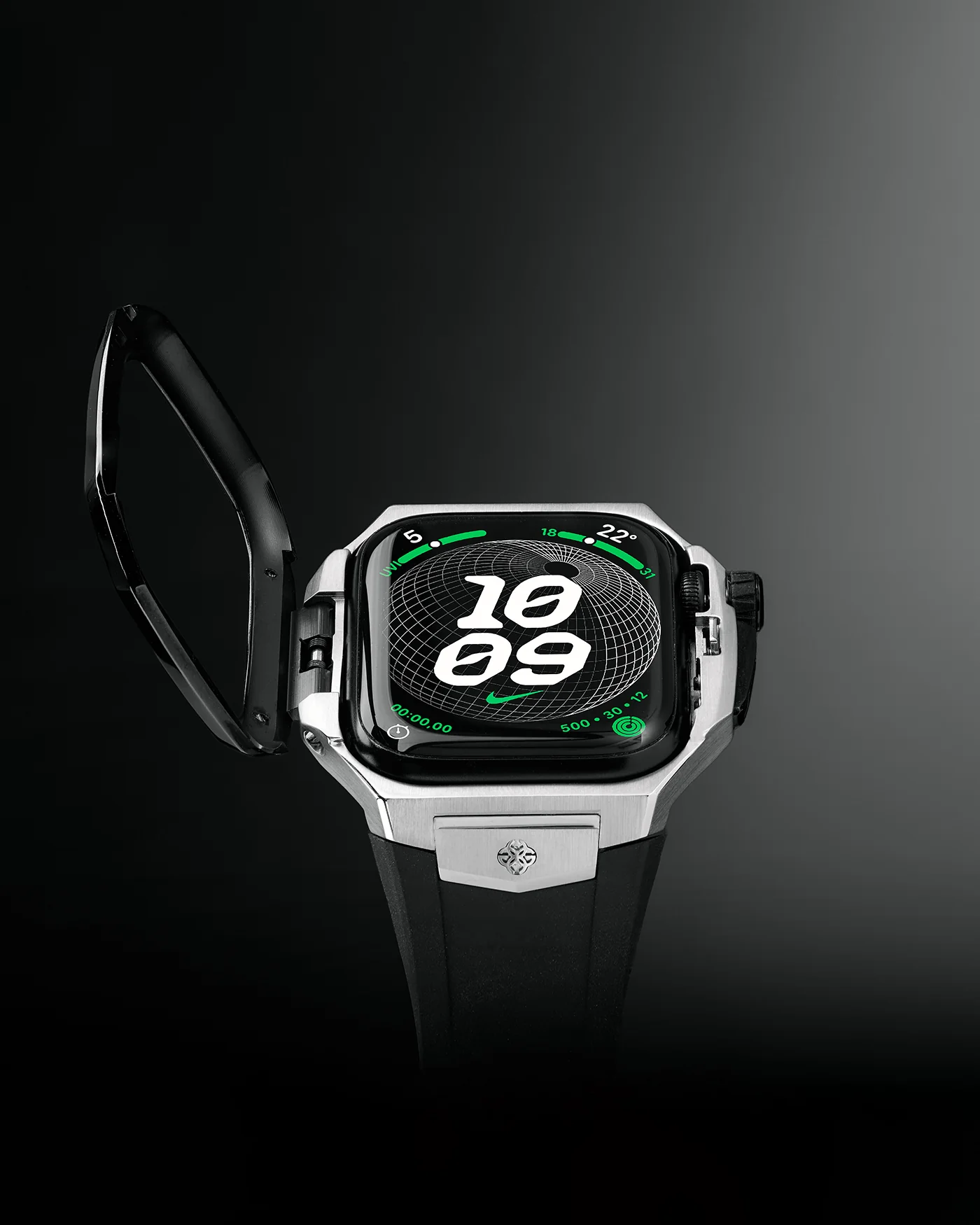 特許取得済みの機構「ハッチベゼル」の開発によって、ワンタッチでアップルウォッチの着脱が可能となりました。従来までのような、ネジを開けたり閉めたりの煩わしさから解放され、TPOに合わせて簡単にケースを付け替える事ができます。ビジネスやレジャーさまざまなシーンに合わせてケースを選ぶことは勿論ですが、生活の中で”ケースを付けない”、外す事も念頭においた設計で、例えばスポーツやランニングなどの際に最大限のパフォーマンスを発揮する為に、ケースを取り外して使用したい場合は簡単に取り外しが出来ます。また、その後は予定に合わせてケースを選び、再びドレスアップすることができます。