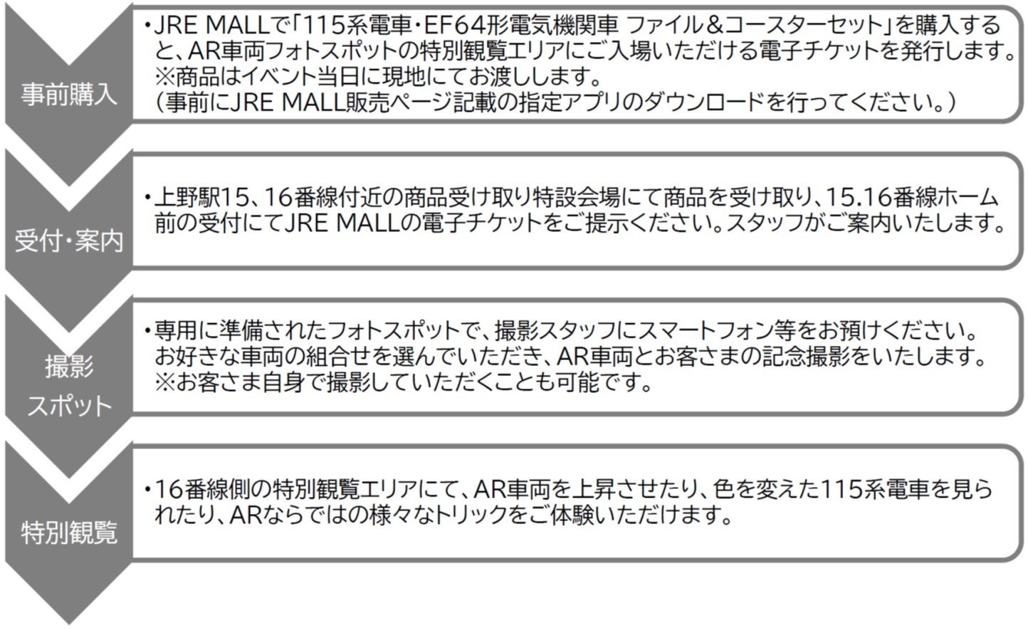 〇参加方法:JRE MALLで以下の商品を事前にご購入いただくと、AR車両フォトスポットの特別観覧エリアにご入場いただける電子チケットを発行します。