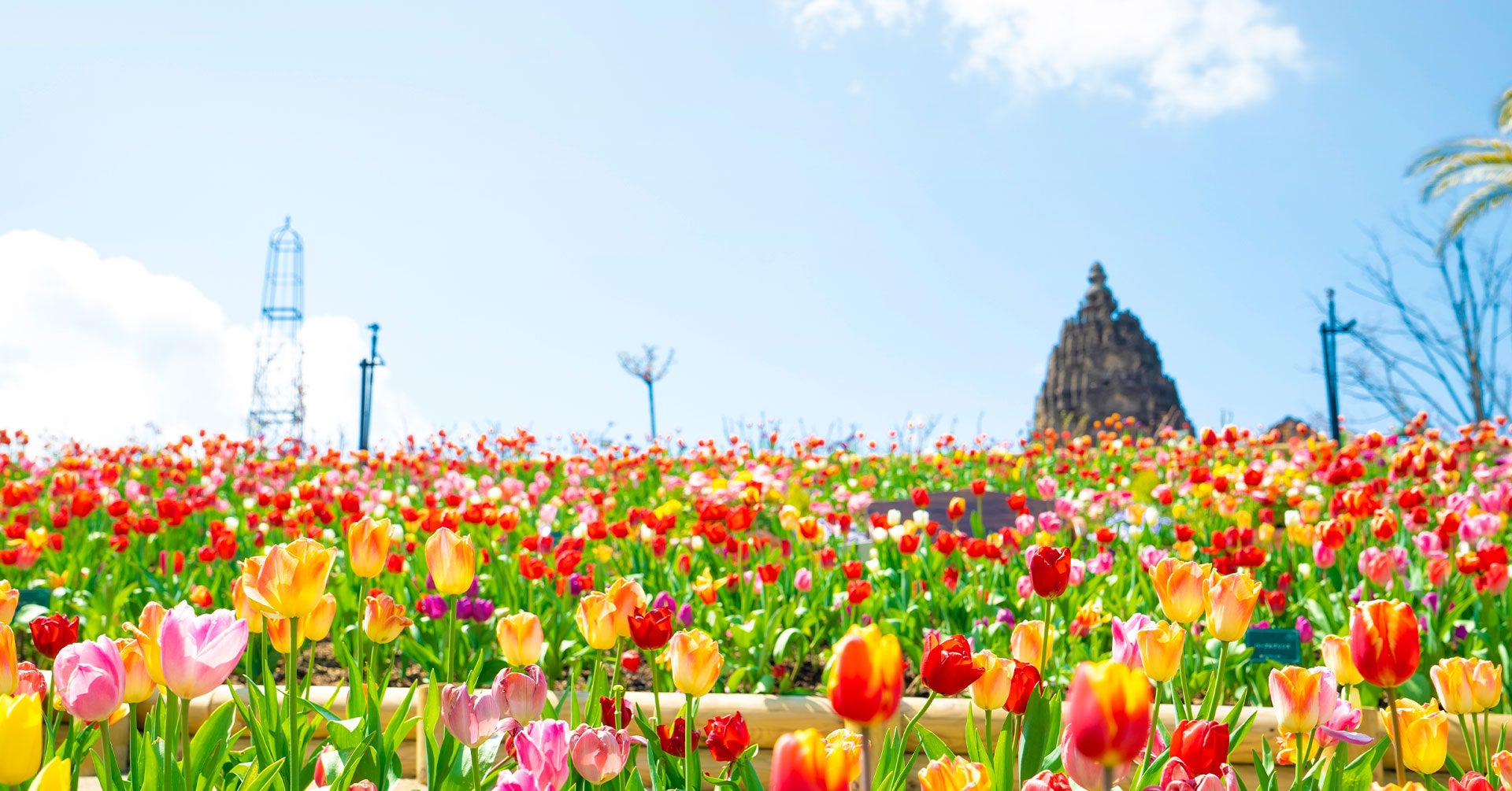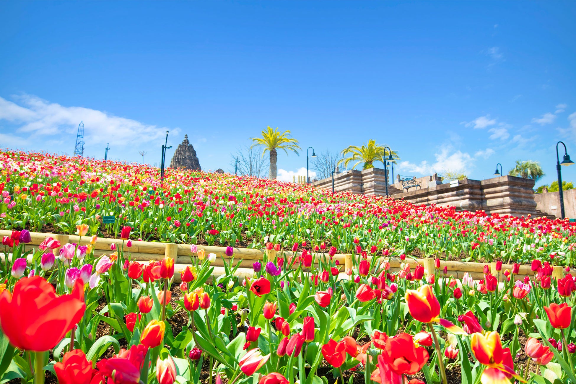 1年を通してさまざまな季節の花を楽しめるレオマ花ワールド。毎年恒例の春のイベント「チューリップ祭」が開催され、約7万本のチューリップとビオラがフラワーガーデンを彩り、見ているだけで気分も明るくしてくれます。また、レオマリゾートならではの、チューリップ畑×亜細亜の復元遺跡のコラボレーションも見どころのひとつ。