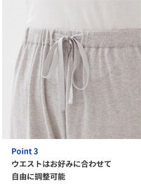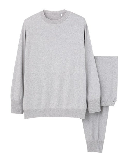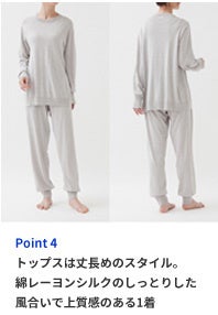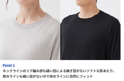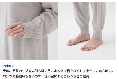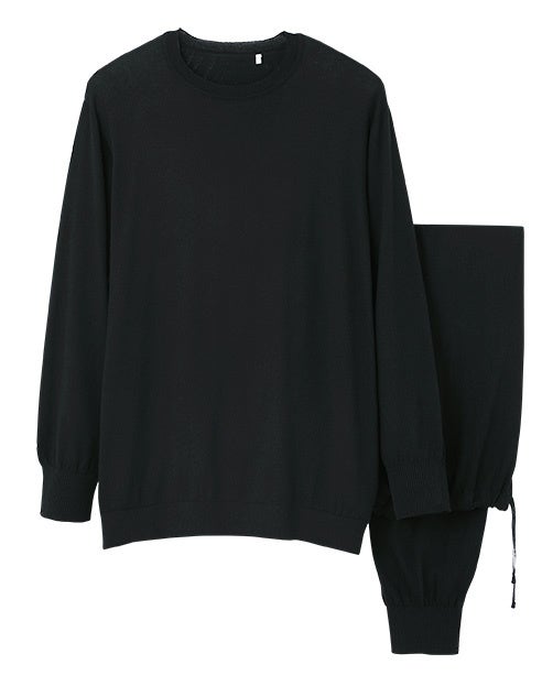 通常ルームウェアは、前身頃、後ろ身頃、袖などのパーツを縫い合わせて形にしますが、「寝落ちスウェット」は編み機で一着まるごと立体的に編み上げるホールガーメントで作られています。トップスは、前身頃と後身頃をつなぐ縫い目がなく、肩のラインも体にフィットし、自然な着心地が得られます。また、パンツの脇にも縫い目がなく、ごわつき感を解消。肌にやさしい綿・レーヨン・シルク混を採用するなど素材にもこだわりました。スウェット派の方はもちろんそうではない方にも体感いただきたい、まさに【寝落ち】してしまうほどのここちいい着用感のスウェットです。