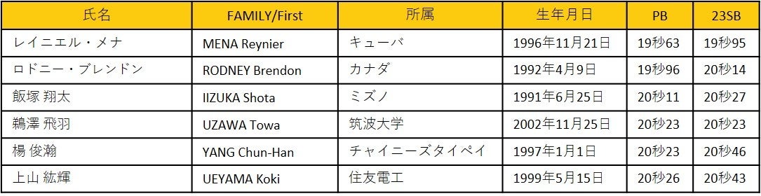 また、19秒96の自己ベストを持ち、オレゴン2022世界選手権男子4×100mリレーでは金メダル、東京2020オリンピック男子4×100mリレーでは銀メダルを獲得しているロドニー・ブレンドン(カナダ)、バンコク2023アジア選手権銀メダリスト、杭州2022アジア競技大会銅メダリストの楊俊瀚(チャイニーズタイペイ)も出場予定です。