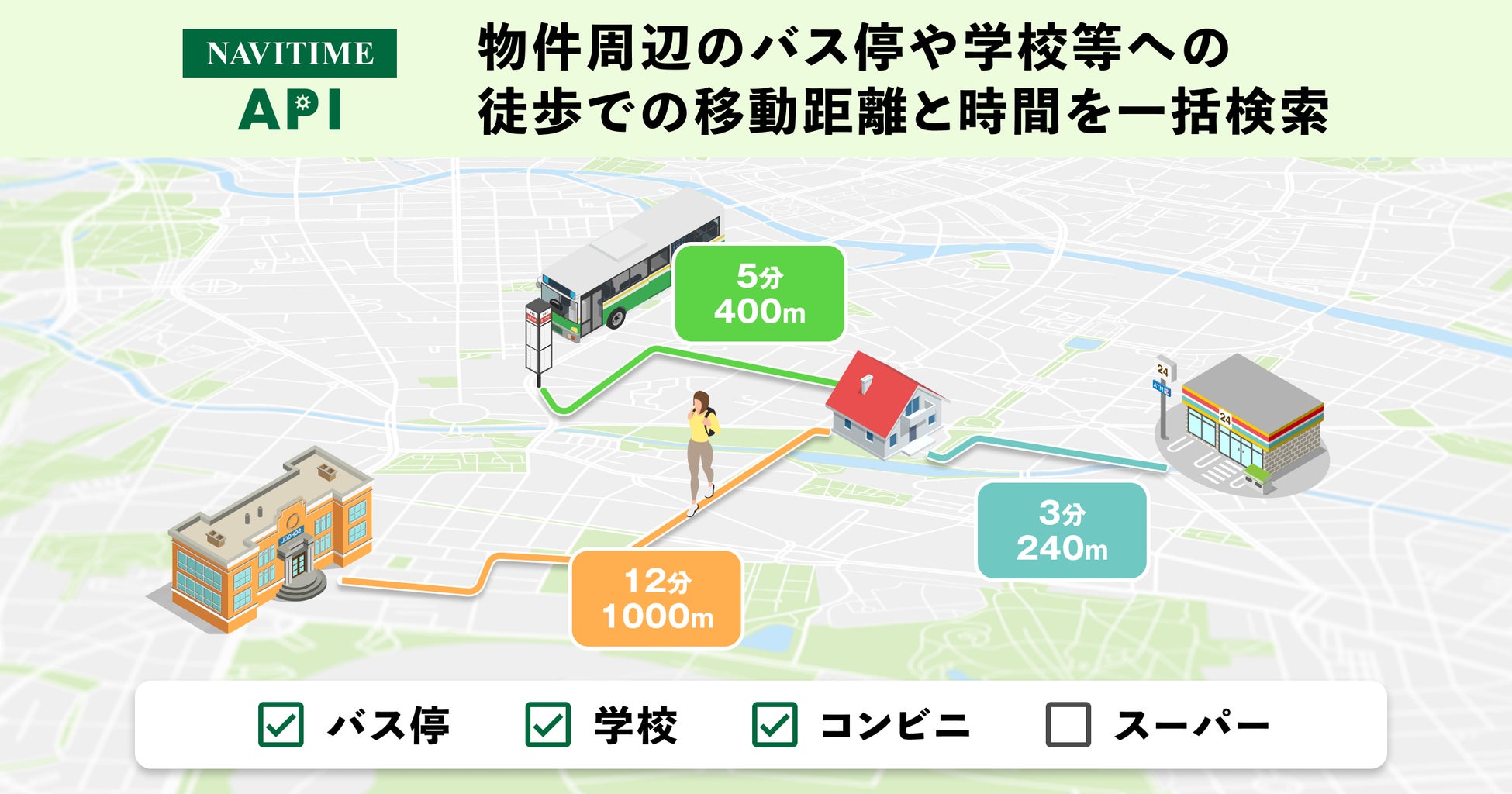 ~不動産業界向けの新機能!物件周辺のバス停や学校等への徒歩での移動距離と時間を一括検索可能~