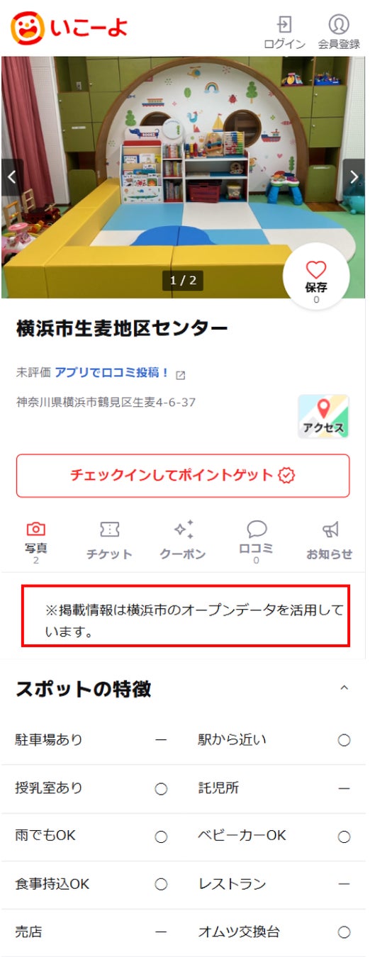 横浜市内18区27館の地区センターのプレイルームのリニューアルに合わせ、神奈川県横浜市の「地区センター(プレイルーム)」のオープンデータを利用しています。データは「いこーよ」サイトおよびスマホ向けアプリの「おでかけ」情報欄に掲載され、どなたでも無料でサービスをご利用いただけます。なお、情報欄にはオープンデータを利用している旨が記載されます。