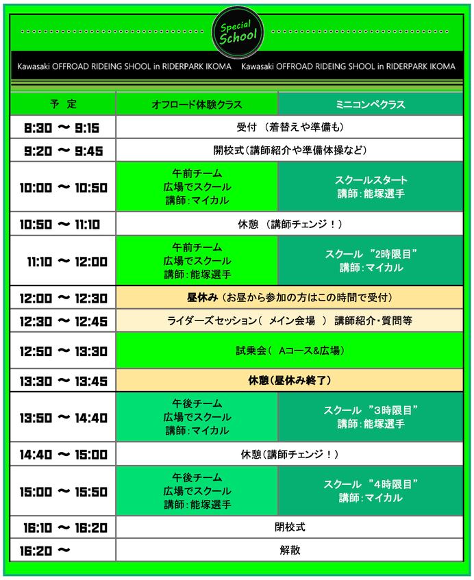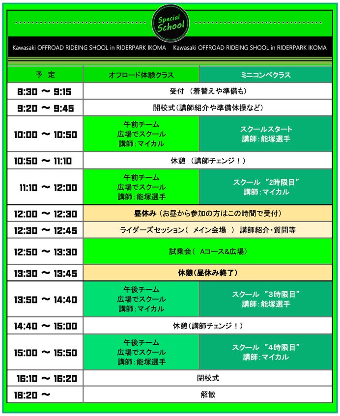 昼休みには「試乗会」も開催を予定しており、カワサキのオフロードバイクを体験いただけます。
