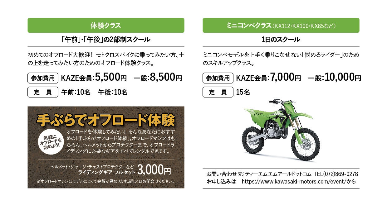 初めてのオフロード大歓迎!オフロードバイクに乗ってみたい方や土の上を走ってみたい方のための「体験クラス」とミニコンペモデルを上手く乗りこなせない悩めるライダーのための「ミニコンペクラス」の2クラス開催。