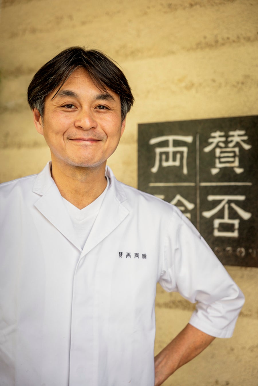 東京・恵比寿にある日本料理店『賛否両論』店主。『正月屋𠮷兆』で修業した後、実家の焼き鳥店『とり将』を継ぎ、2004年に『賛否両論』をオープン。確かな調理技術と卓越した料理センスから生まれる独創的な和食が評判を呼び、瞬く間に予約のとれない人気店に。2013年には名古屋店もオープン。雑誌やテレビ、全国のイベントなど多方面で幅広く活躍し、和食の魅力を伝えている。プロのコツを楽しく解説するYouTube(チャンネル登録者は109万人/2025年7月現在)や家庭で作りやすいレシピが満載の著書も大好評。ビールとサウナ、家族をこよなく愛している。