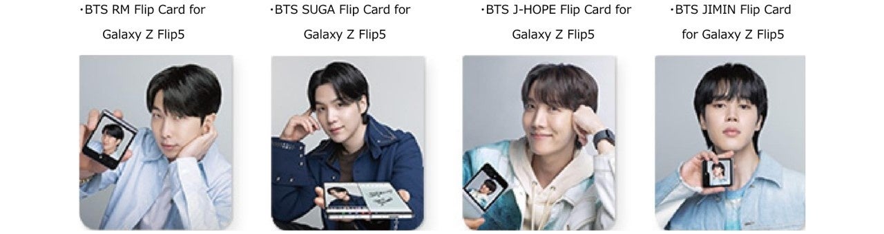 このキャンペーンは、「Galaxy Z Flip5」をご購入・ご応募いただいた方全員に、Samsung Membersアプリに届くFlip Card引き換えクーポンをお渡しし、12種の中からお好きなFlip Cardを1つプレゼント。さらに、お届け時にランダムで「RM,SUGA,J-HOPE,JIMIN of BTS」のBTSデザインFlip Cardがもう1枚付いてくるプレゼントキャンペーンです。