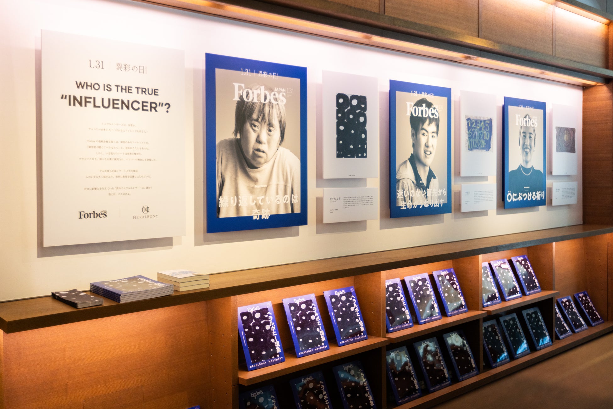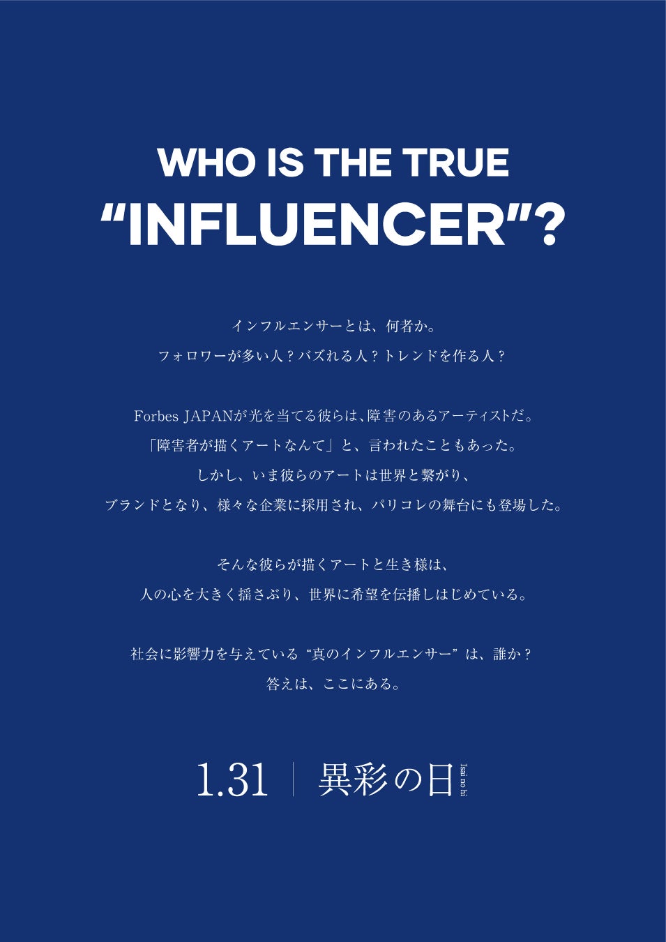 異彩の日のアクションとして、Forbes JAPANとヘラルボニーの2社による共同ステートメント「WHO IS THE TRUE “INFLUENCER”?」を発表します。1月29日に発売されるForbes JAPAN別冊「ヘラルボニー現象」をきっかけに、この“現象”の源にある“異彩”を放つ作家ひとりひとりが持つ社会への影響力に光を当て、障害のある作家が起用されたForbes JAPANの表紙をイメージしたポスターを掲示することで、社会の常識を問い直すメッセージです。