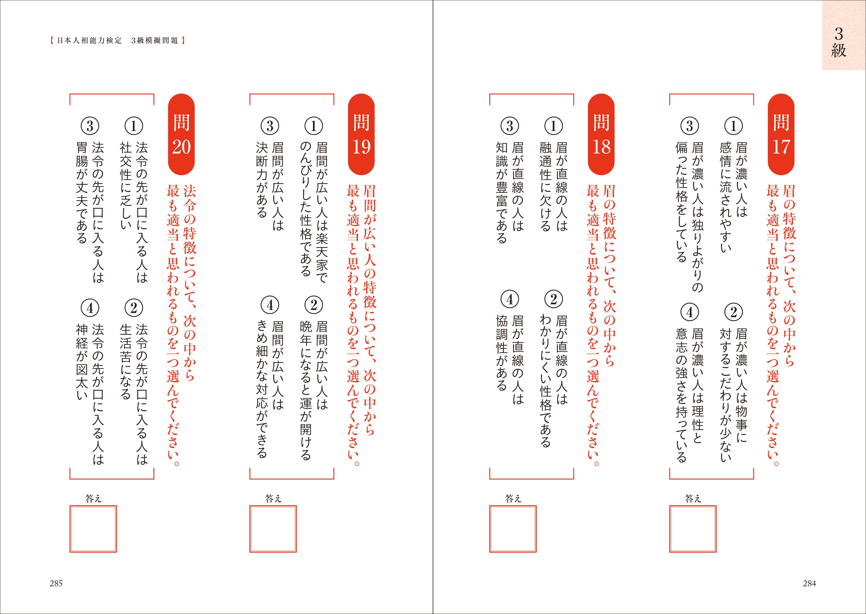 本書では、その基礎を各章で解説し、職業の適正までを章立てで網羅、かつ巻末に「日本人相能力検定」模擬問題集をつけました。ぜひ本書を参考に、顔つきからその人の内面や性格の癖を見抜く力を養ってみてください。その技術を基に相手の立場や気持ちを想像し、広い視点で人間関係を豊かにすることにお役立ていただければ幸いです。