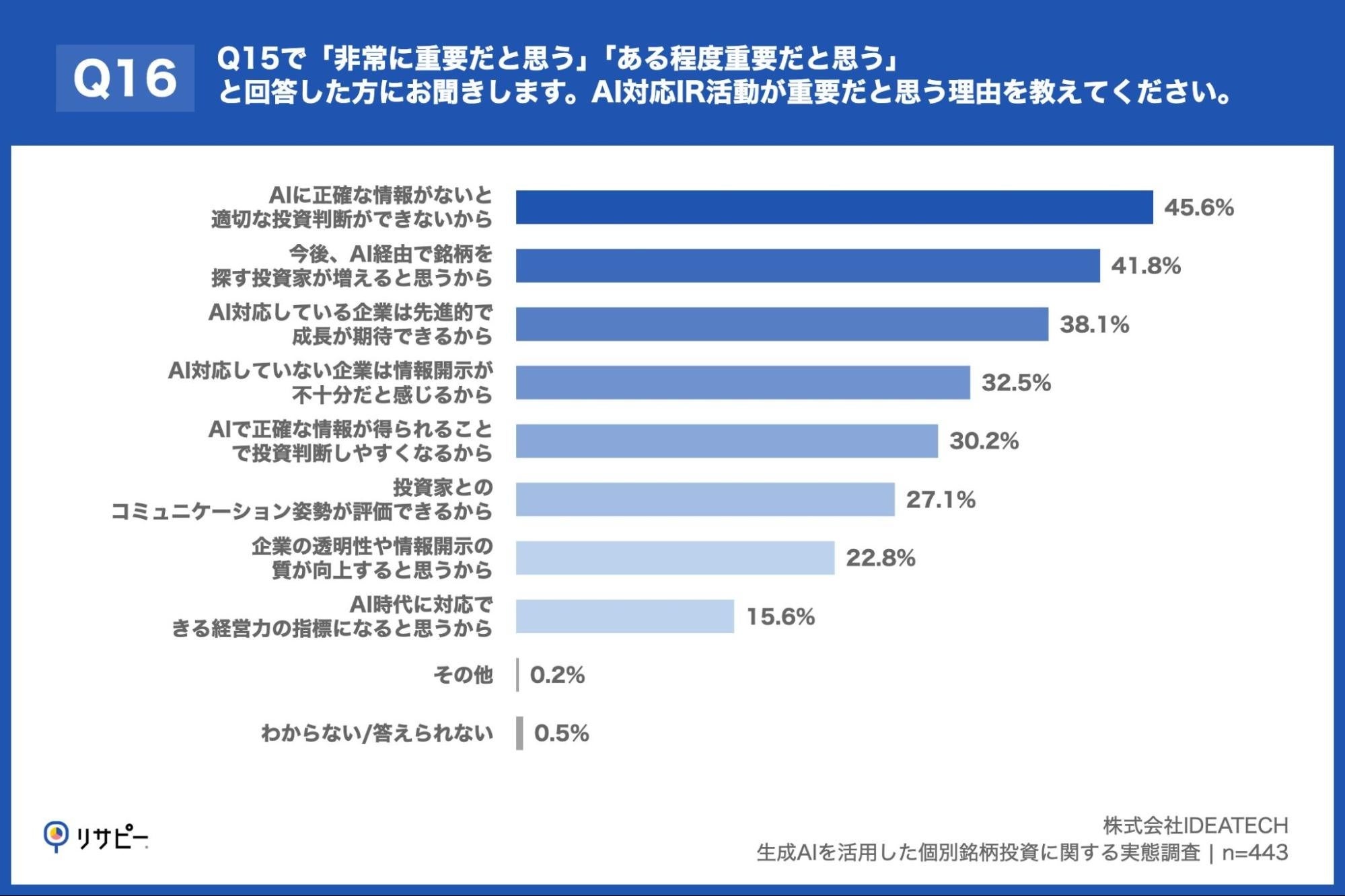 「Q16. Q15で「非常に重要だと思う」「ある程度重要だと思う」と回答した方にお聞きします。AI対応IR活動が重要だと思う理由を教えてください。(複数回答)」(n=443)と質問したところ、「AIに正確な情報がないと適切な投資判断ができないから」が45.6%、「今後、AI経由で銘柄を探す投資家が増えると思うから」が41.8%、「AI対応している企業は先進的で成長が期待できるから」が38.1%という回答となりました。