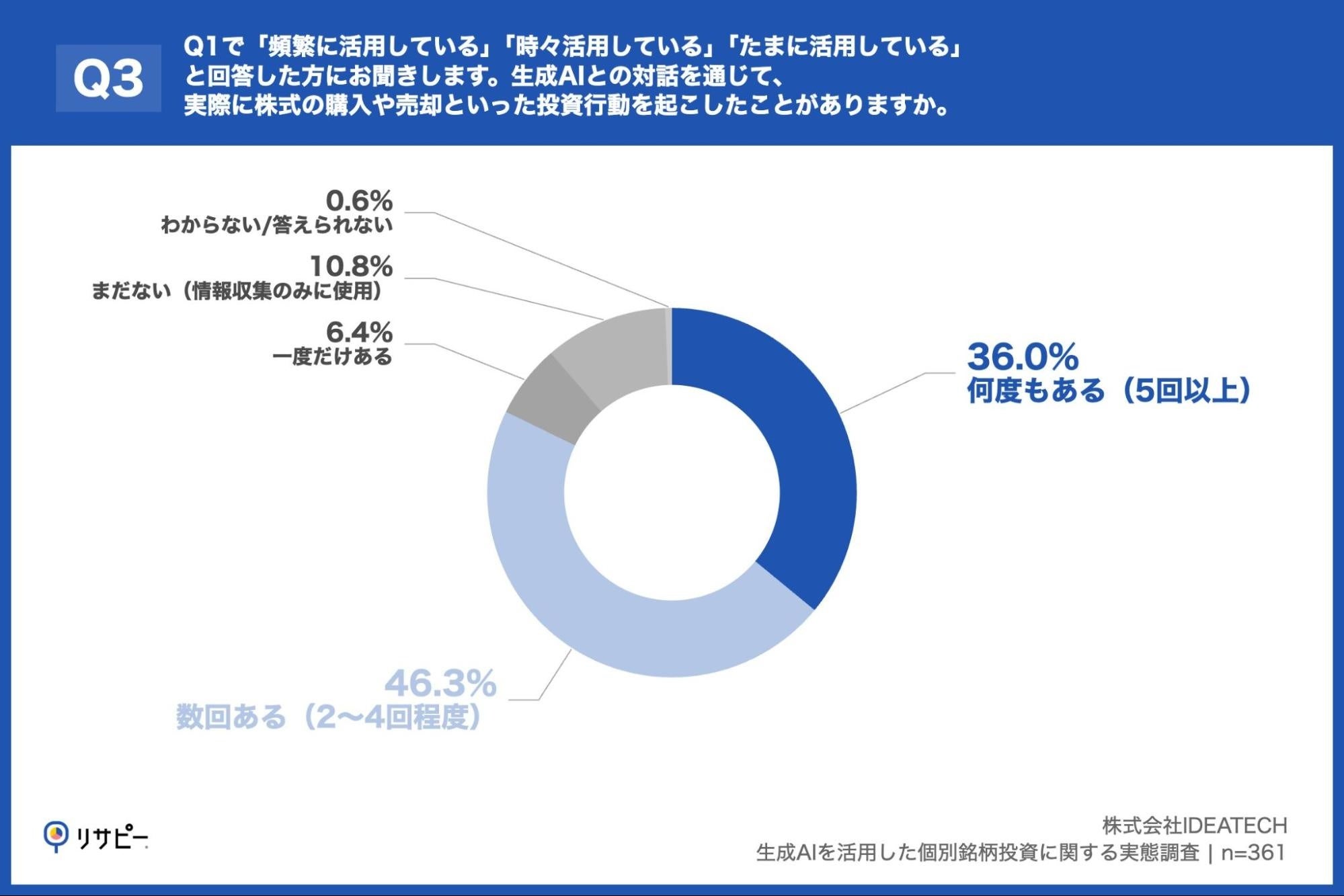 「Q3. Q1で「頻繁に活用している」「時々活用している」「たまに活用している」と回答した方にお聞きします。生成AIとの対話を通じて、実際に株式の購入や売却といった投資行動を起こしたことがありますか。」(n=361)と質問したところ、「何度もある(5回以上)」が36.0%、「数回ある(2~4回程度)」が46.3%という回答となりました。