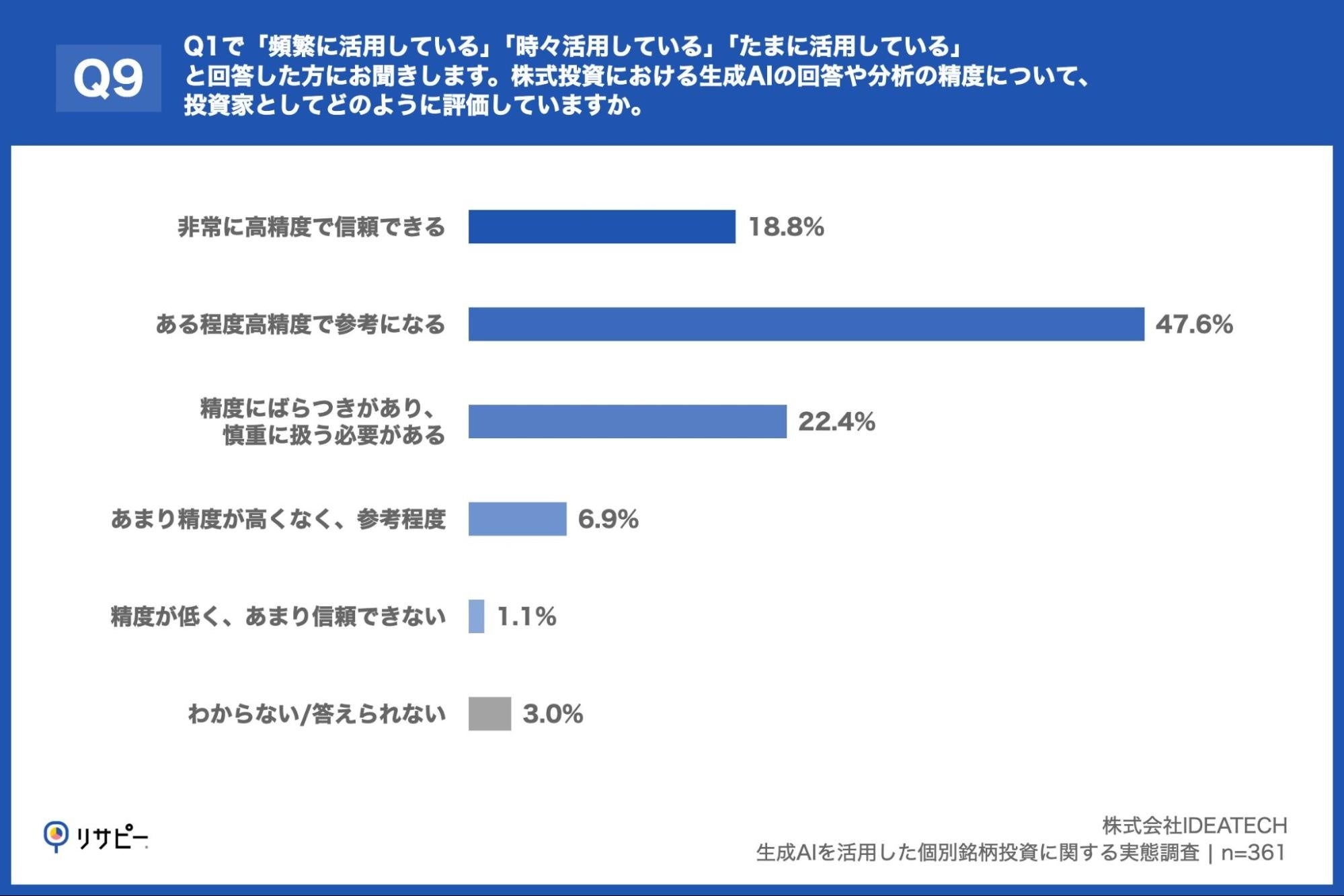 「Q9. Q1で「頻繁に活用している」「時々活用している」「たまに活用している」と回答した方にお聞きします。株式投資における生成AIの回答や分析の精度について、投資家としてどのように評価していますか。」(n=361)と質問したところ、「非常に高精度で信頼できる」が18.8%、「ある程度高精度で参考になる」が47.6%という回答となりました。