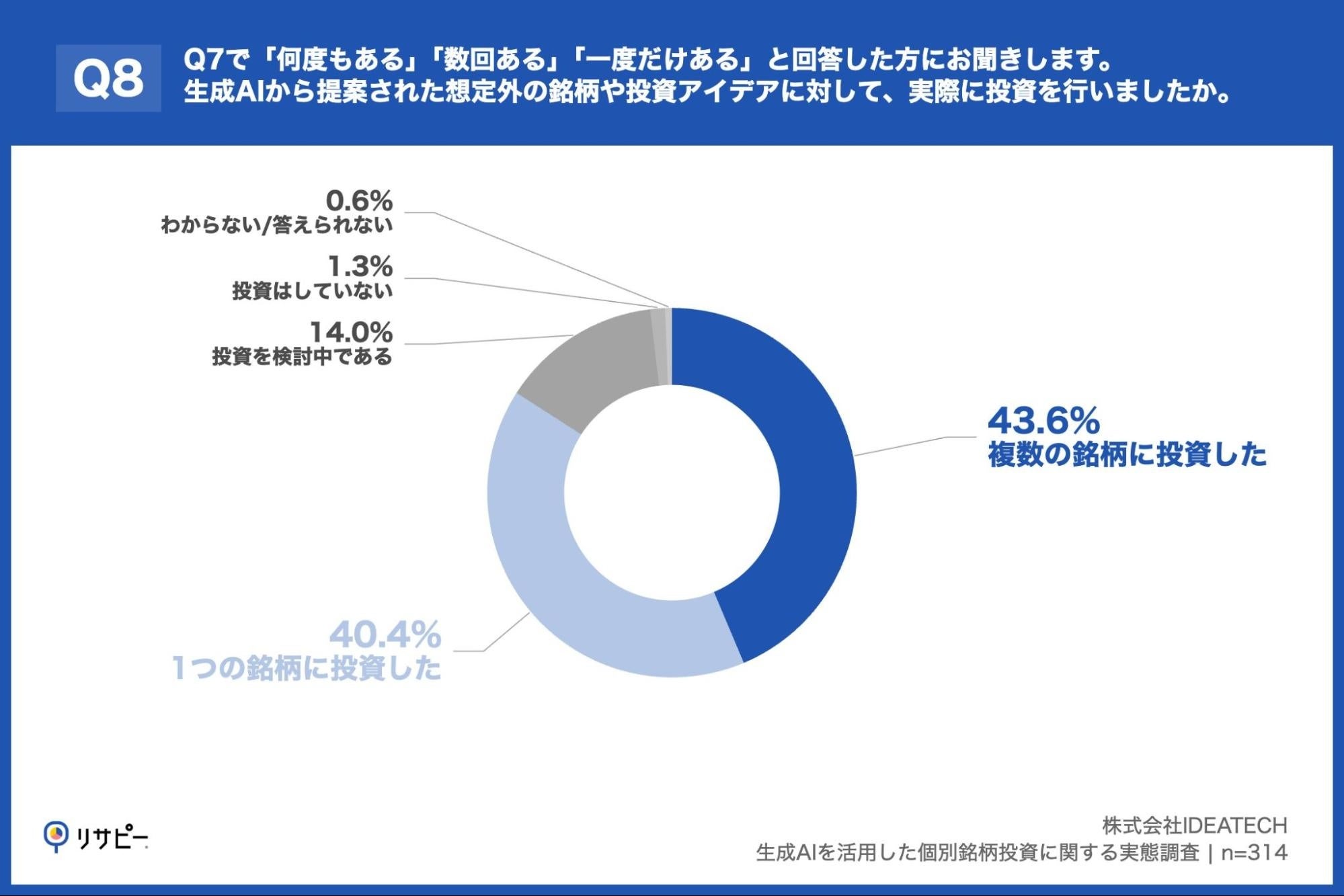 「Q8. Q7で「何度もある」「数回ある」「一度だけある」と回答した方にお聞きします。生成AIから提案された想定外の銘柄や投資アイデアに対して、実際に投資を行いましたか。」(n=314)と質問したところ、「複数の銘柄に投資した」が43.6%、「1つの銘柄に投資した」が40.4%という回答となりました。