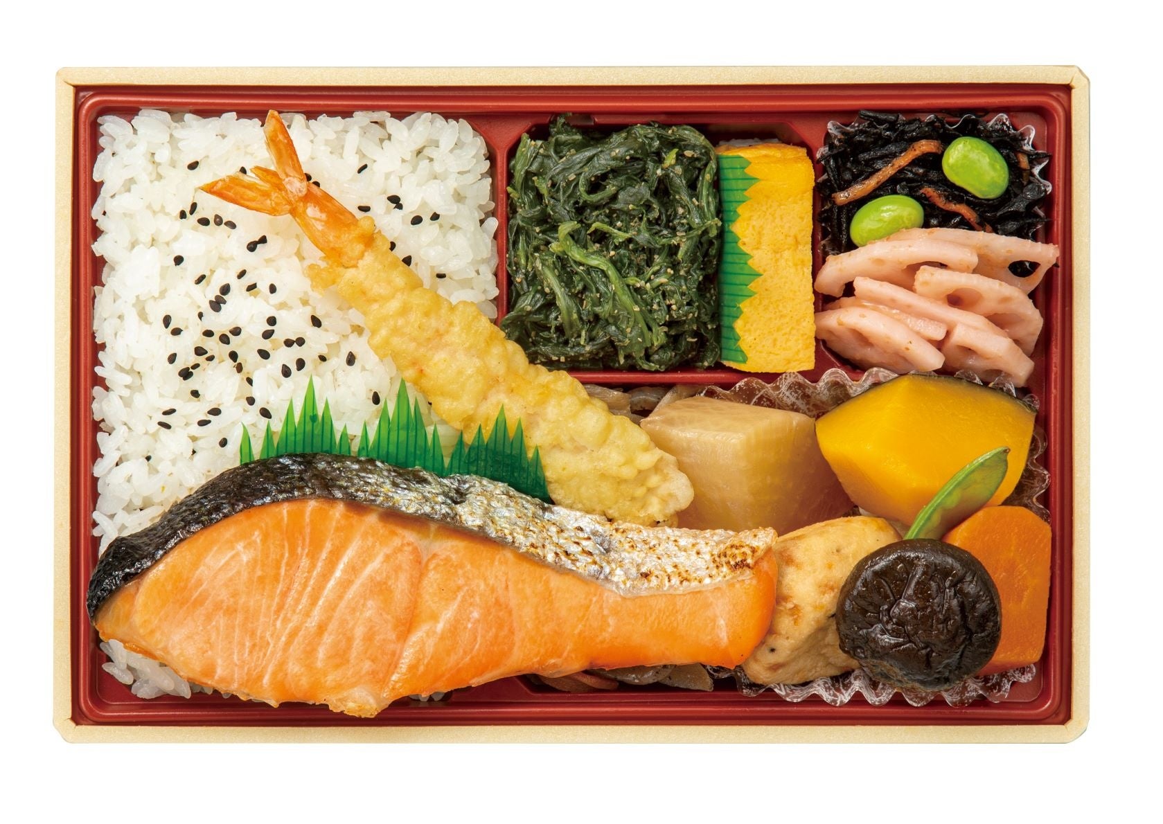 【内容】「おいしく減塩」、「野菜たっぷり」をコンセプトに、健康に配慮した栄養バランスの取れた食事「スマートミール」の弁当です。炙り焼きした銀鮭は、中はジューシーで外は香ばしく、海老の天ぷら・煮物・厚焼き玉子・金平炒め・ほうれん草胡麻和え・蓮根梅肉和え・ひじき煮等を盛り付けました。