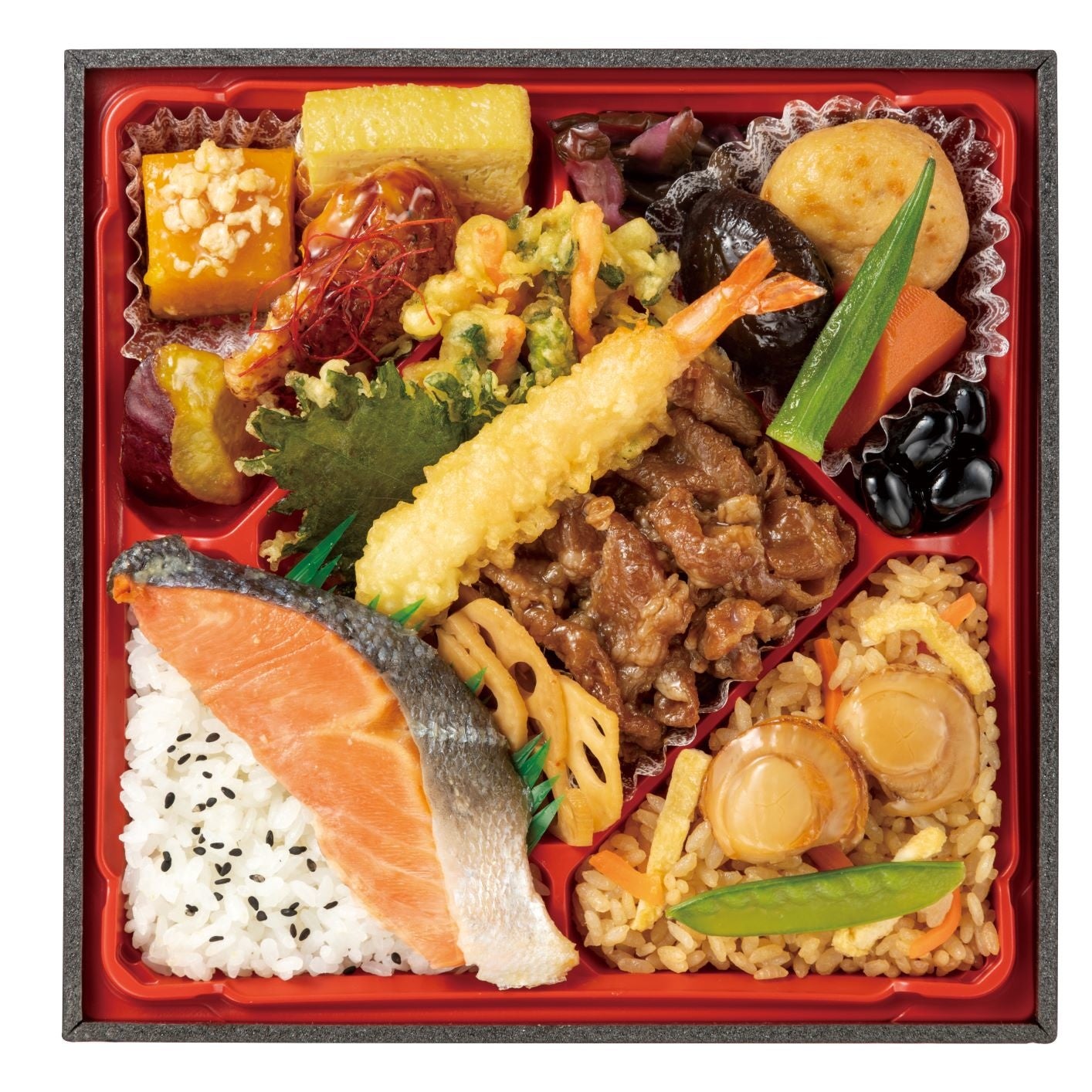【内容】ホタテをのせた茶飯と白飯の2種類を盛り付けました。紅鮭の西京焼をメインに、牛すき煮・海老天・枝豆と根菜のかき揚げ・鶏の照り焼等、それぞれ味わいにこだわった11種類のおかずを盛り合わせました。