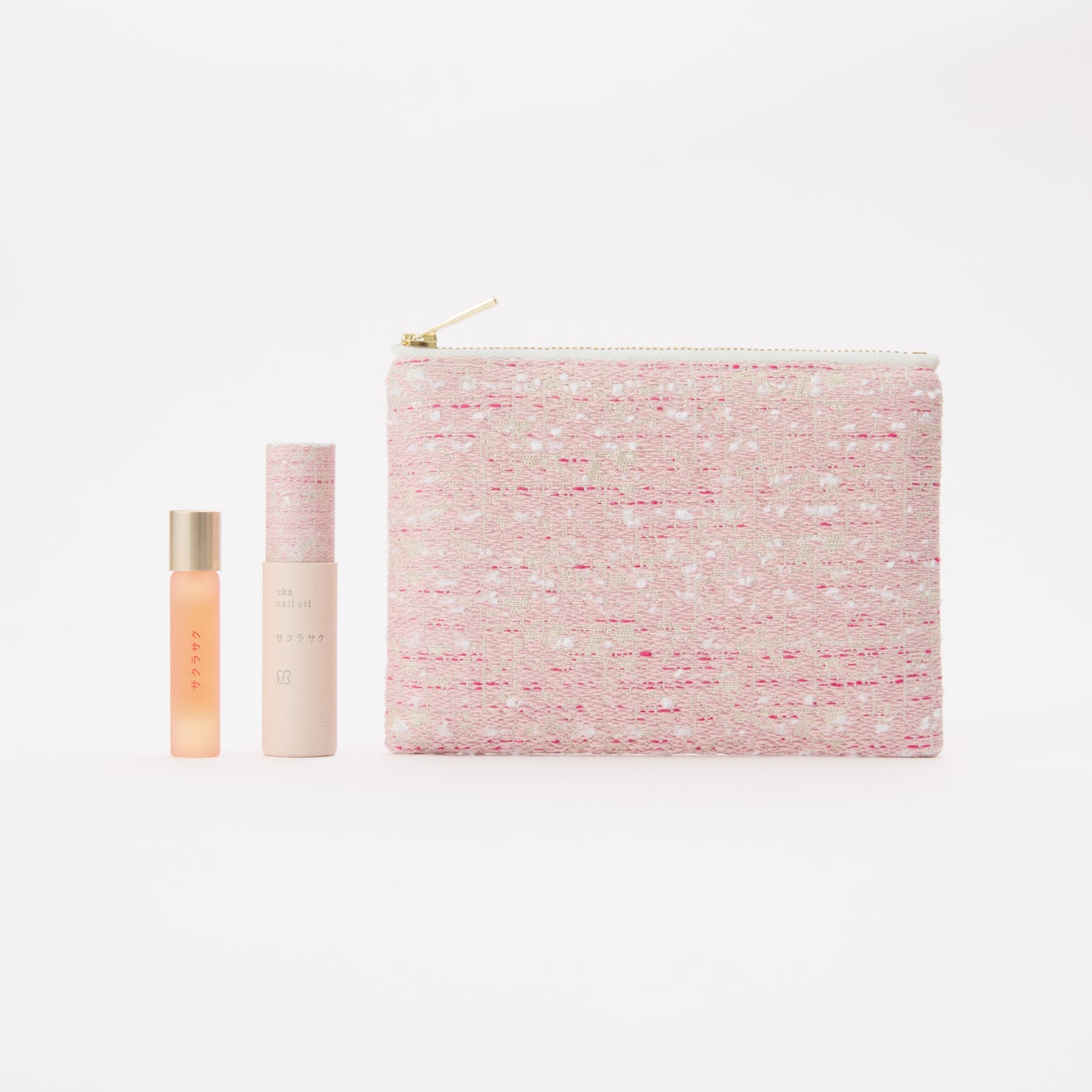 ポーチのテキスタイルは、表情の異なる2色のピンクとゴールドが織りこまれた優雅で美しいパターン。深みのあるピンクが加わったことでコントラストが生まれ、春の陽光の中に浮かび上がるサクラの花びらのように、美しい輝きを放ちます。毎年変わるポーチのインナーカラー。今年は澄み切った青空を思わせる鮮やかなブルー。春の清々しい印象を与えます。