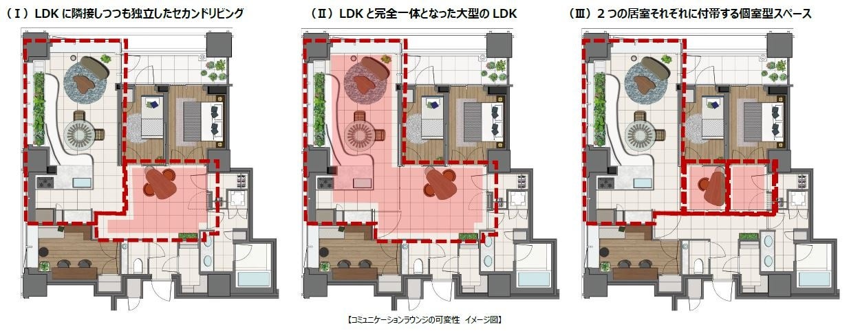 住戸内の各所において、連続的にインドアグリーンを感じられるよう「コミュニケーションラウンジ」には透過性のあるガラスドアを採用しました。コミュニケーションラウンジからはグリーンポケットを見通すことが出来るため、緑の連続性が空間に広がりをもたらすと同時に、家で過ごす室内の時間においても自ずと植物が目に入る機会を増やします。また、複数の可動間仕切りによる可変性の高い空間構成が、多様なライフスタイルやライフステージの変化に応じた様々なニーズに対応します。