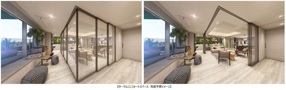 本プランは、設備機器を用いて人工的に環境をコントロールするのではなく、“自然と調和し、その力を活かしながら快適に過ごす”という、日本家屋に見られるパッシブデザインの考え方にヒントを得た空間設計が特徴です。住戸全体を空気が流れるよう、襖や障子からデザインの着想を得た「スライドドア」によって風の通り道を確保し、自然通風による温度低減を目指しております。また、内と外を繋ぐ縁側のような空間に、“空間自体を断熱層に見立てる”という考え方を取り入れた新たな中間領域「サーマルコンフォートスペース」が、外気温の温度変化によるリビング・ダイニングへの影響を抑制することが期待されます。その他にも庇や簾のような、日射しを調整することが出来る「オーニング」や「ブラインド」を設置しました。