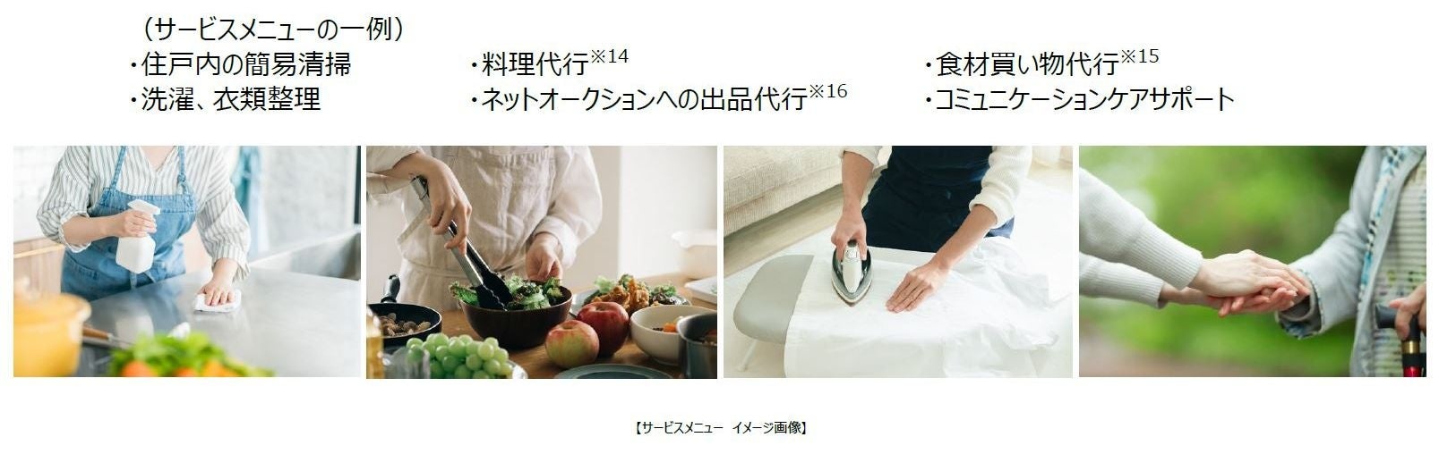 生活密着型のサービス「ケアホームアテンダント」を提供いたします。忙しい共働き世帯やシニア世帯を中心に、住戸内の簡易な清掃は勿論、食材の購入からも依頼することが可能な料理代行、ネットオークションへの出品代行等、便利なサービスで日々の生活をサポートします。この他にもシニア層に向けたメニューとして、ご利用者との対話に重きを置いて日々の様々なお困りごとのご相談・お手伝いを行う、コミュニケーションケアサポートもご用意し、ひとりひとりのくらしに寄り添ったサービスを提供します。