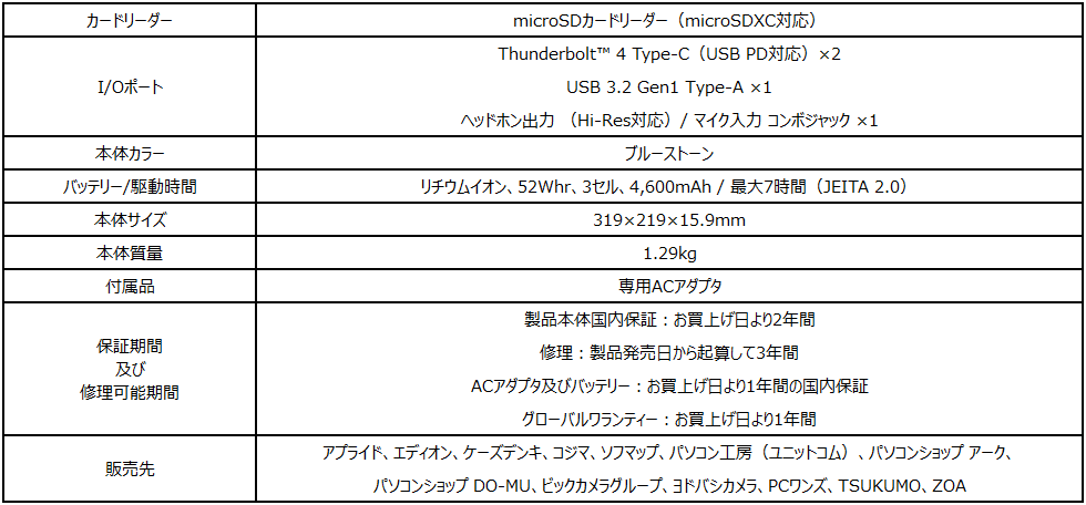 「Prestige-14-A12SC-239JP」は、本体に爽やかなブルーストーンを採用した薄型・軽量・ビジネス・クリエイターノートPCです。14インチサイズの本体は薄さ15.9mm・軽さ1.29kgでビジネスバッグやバックパックへ簡単に収納可能で気軽に持ち運ぶことができます。本体カラーは爽やかなブルーストーンを採用し、屋外・屋内問わずビジネスシーンからプライベートシーンで違和感溶け込める色になっています。CPUにハイブリッドコアアーキテクチャを採用してパワフルなPコアと省電力なEコアを備え、大幅に性能が向上した『第12世代インテル® Core™ プロセッサー』、専用グラフィックス機能として「NVIDIA® GeForce® GTX 1650 Max-Q デザイン」を搭載。オフィスソフトやWebブラウザなど複数のソフトを同時に起動するマルチタスクでも重くなることなく快適な動作が可能なうえ、専用グラフィックス機能のパワーを活用して動画・画像編集ソフトや3Dアニメーション作成や3Dデザイン制作など一般的なノートPCでは動作させることが難しいクリエイティブソフトを使用することができます。このほか、アメリカのMIL規格「MIL-STD 810G」に適合する高い耐久性と信頼性や簡単・安心・安全にログインできるWindows Hello対応生体認証機能、プロ向けType-Cデバイスを接続できるThunderbolt™ 4 Type-Cなど持ち運べるノートPCに必要な機能をしっかり備えた万能モデルとなっています。