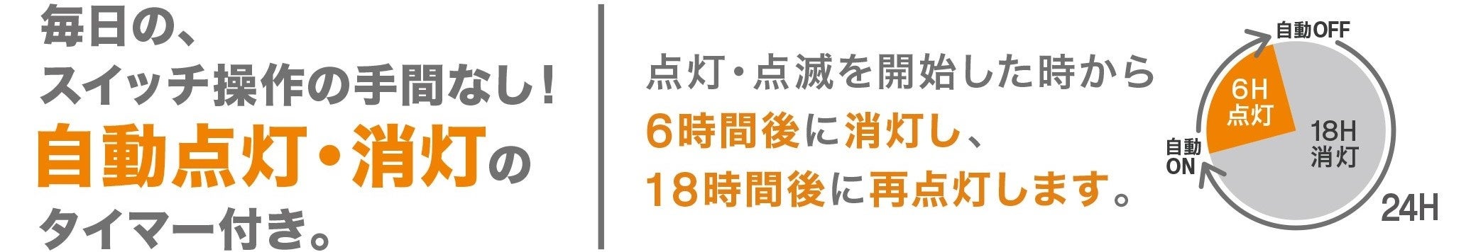 タイマー機能は、6時間後に消灯し、18時間後に再点灯する機能です。例えば17時に点灯し、23時に消灯、翌日17時に点灯を繰り替えせるため、毎日のスイッチ操作の手間がありません。また、切り忘れもないため節電効果も期待できます。