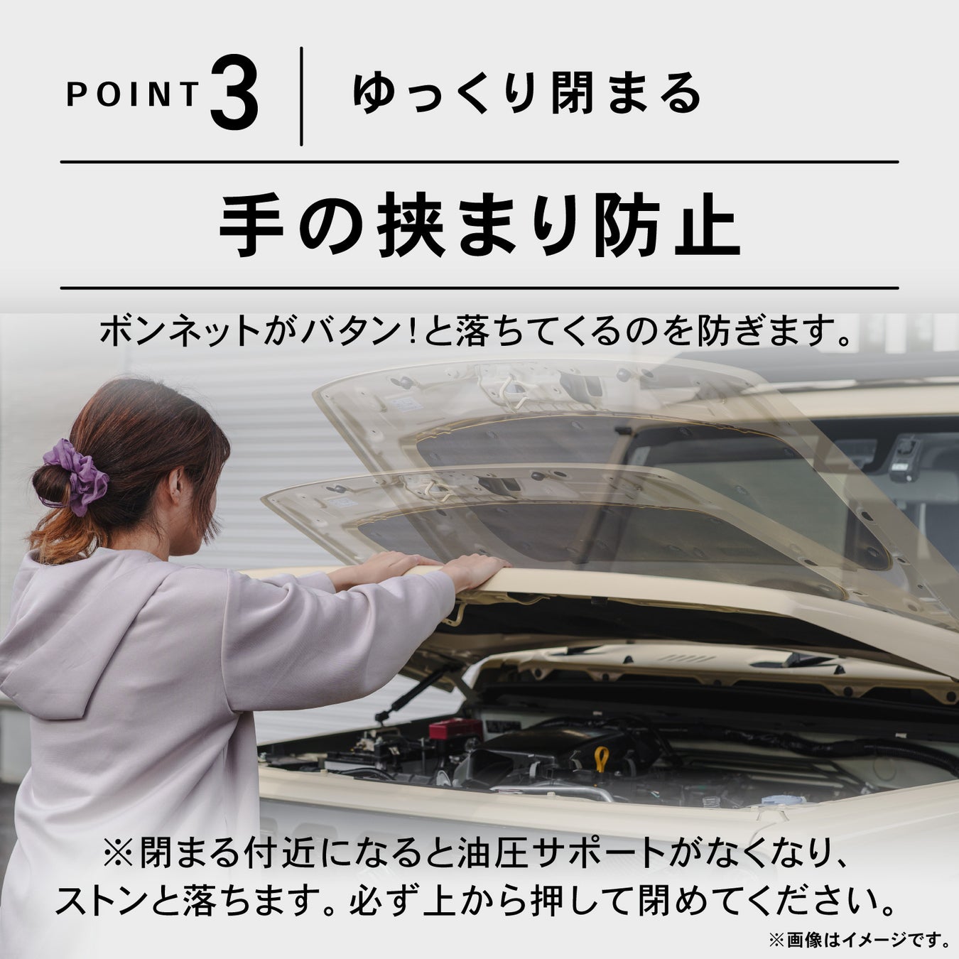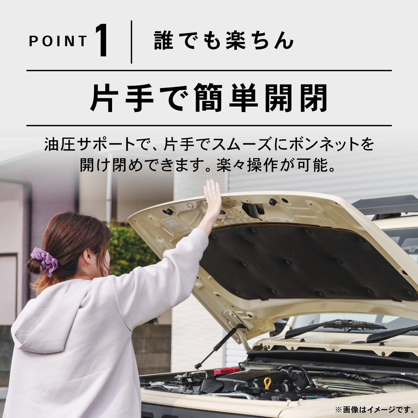 油圧サポートで、片手でスムーズにボンネットを開け閉めできます。