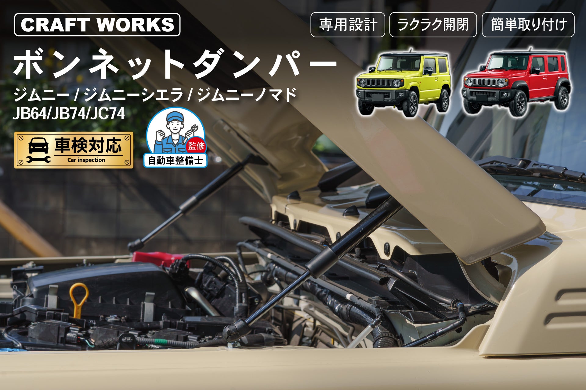 【新発売】ジムニー/ジムニーシエラ/ノマド専用 JB64W JB74W JC74W専用 ボンネットダンパー。ジムニー専用設計。これひとつで変わる、ラクさとこだわり。整備も掃除もスムーズに!