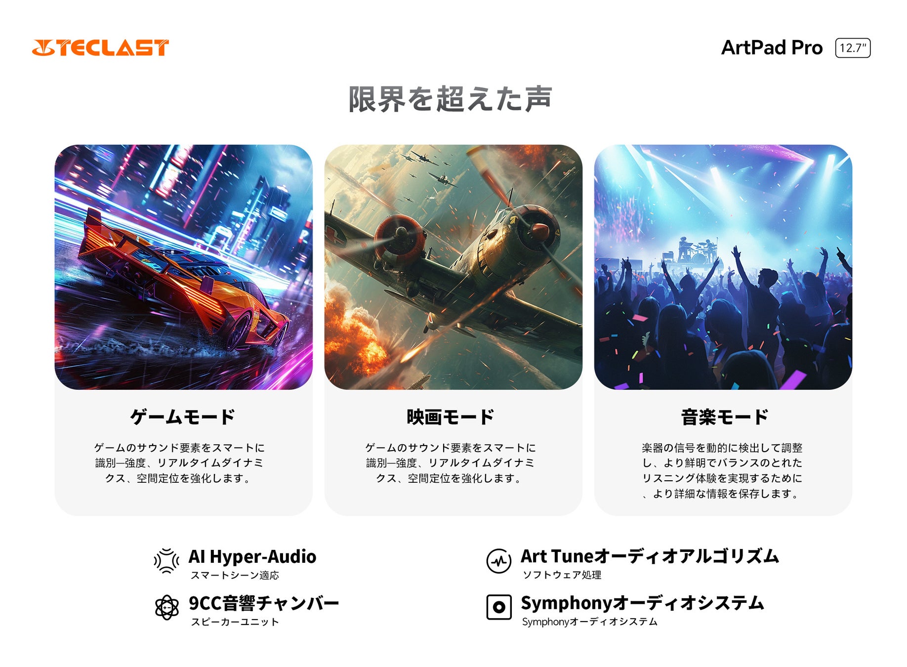ArtPad Proは、業界初のSymphony Sound Chamber Systemと9CC大型スピーカーを搭載し、優れた音響性能を実現。Teclast独自のArtTuneアルゴリズムと没入感のあるサウンドモードにより、豊かで迫力のあるリアルなサウンドを提供します。