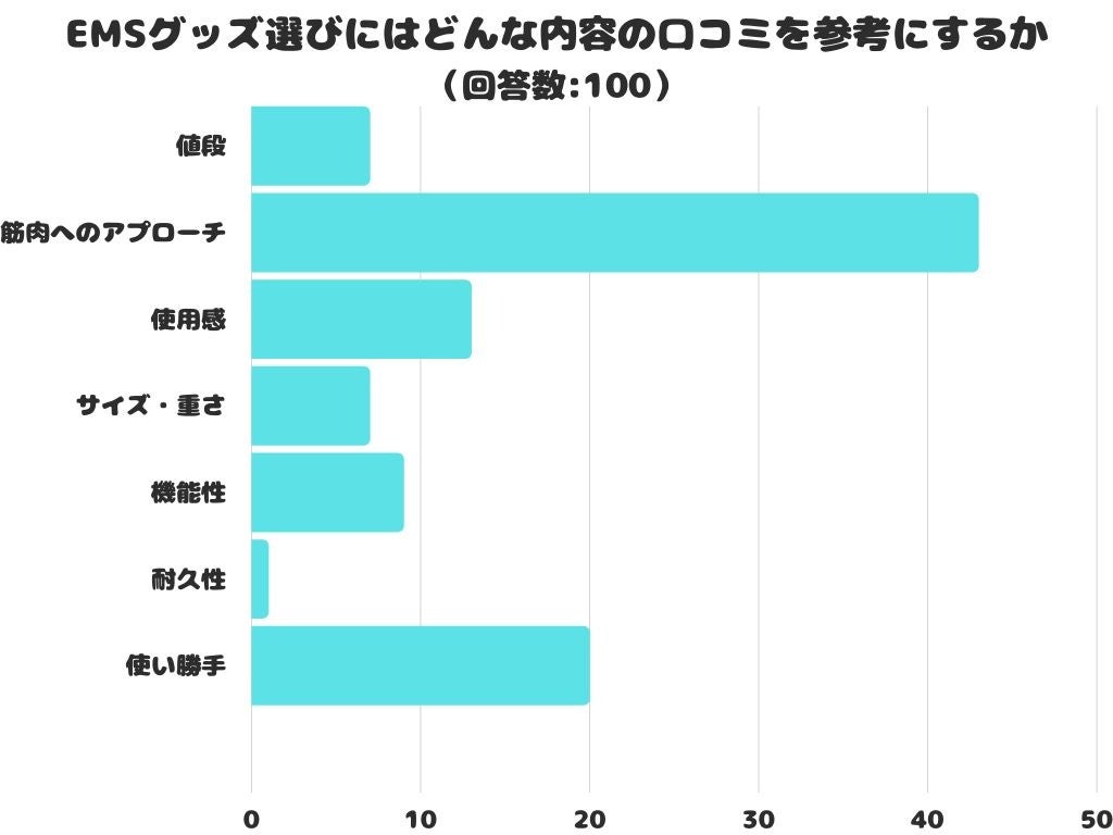 EMSグッズのどんな内容の口コミを参考にするかをアンケートにて調査したところ、1位は「筋肉へのアプローチ」でした。