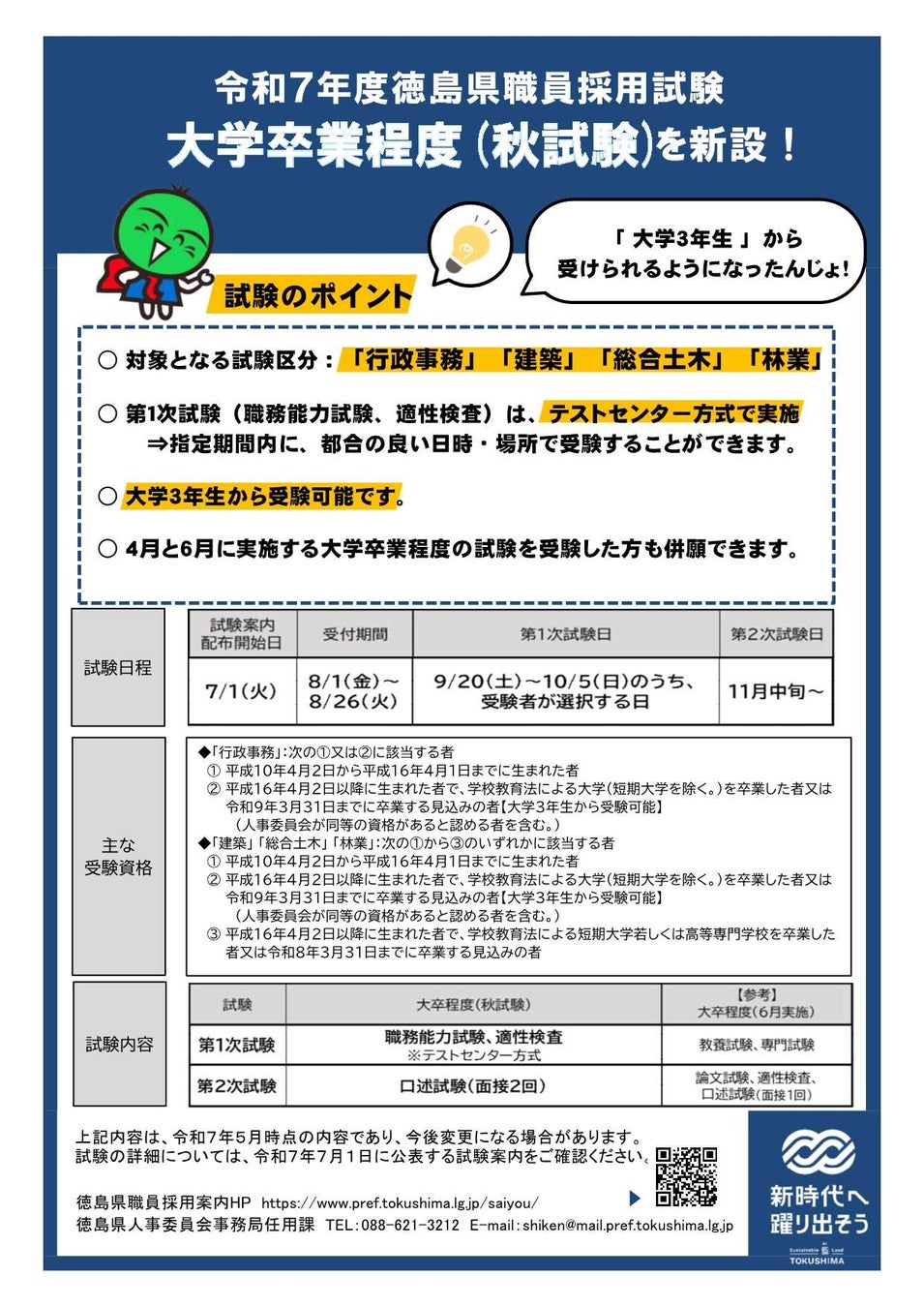 詳細は、徳島県職員採用案内ホームページ等より御確認ください。