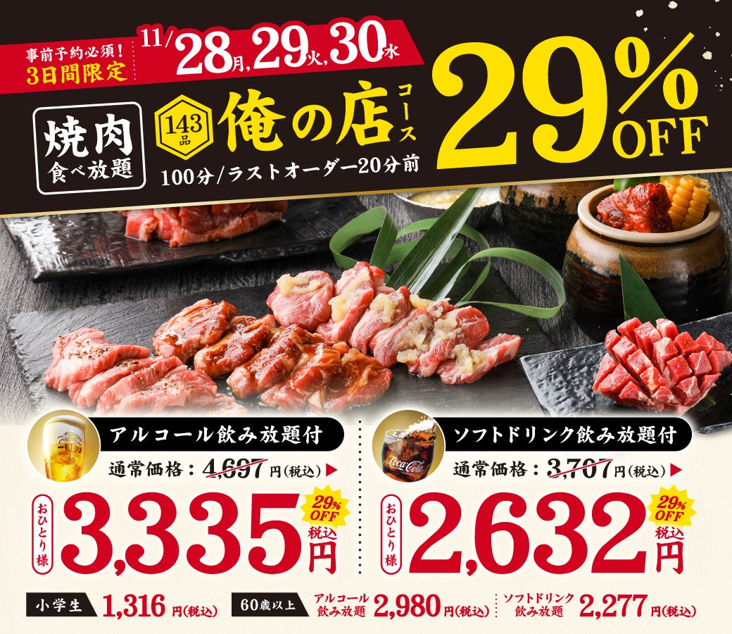 【期間限定】11月29日は、年に1度の“いい肉の日”!焼肉食べ放題の「俺の店 イオンタウン野々市店」「俺の店 高崎西口駅前店」の2店舗限定でお得なセールを実施!