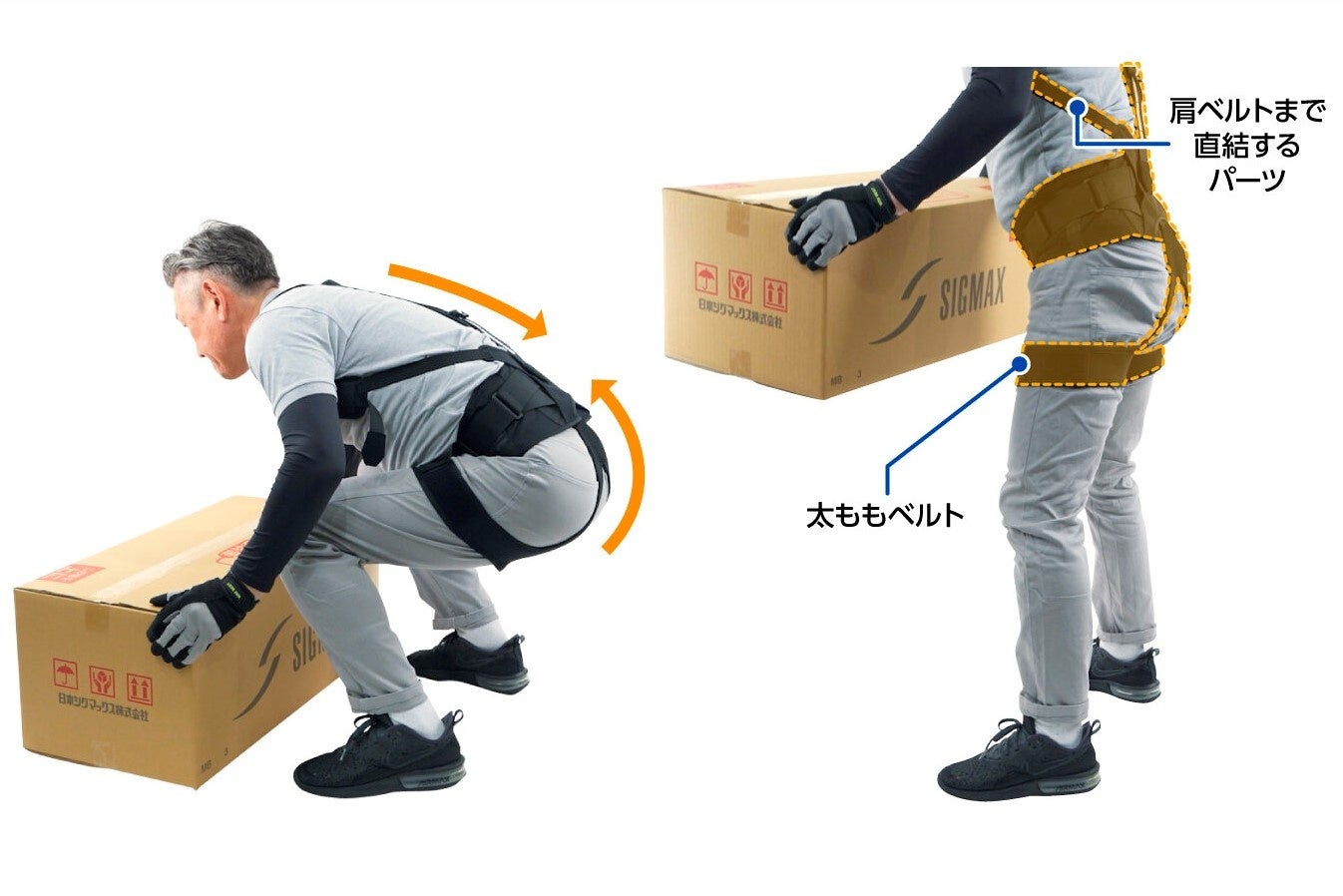 腰サポーター出荷枚数No.1(※3)メーカーの日本シグマックスのノウハウを活かし、 “腰サポーター”一体型のアシストスーツにすることで、「前傾・中腰姿勢」だけでなく、「立ち姿勢」時も腰の負担を軽減。