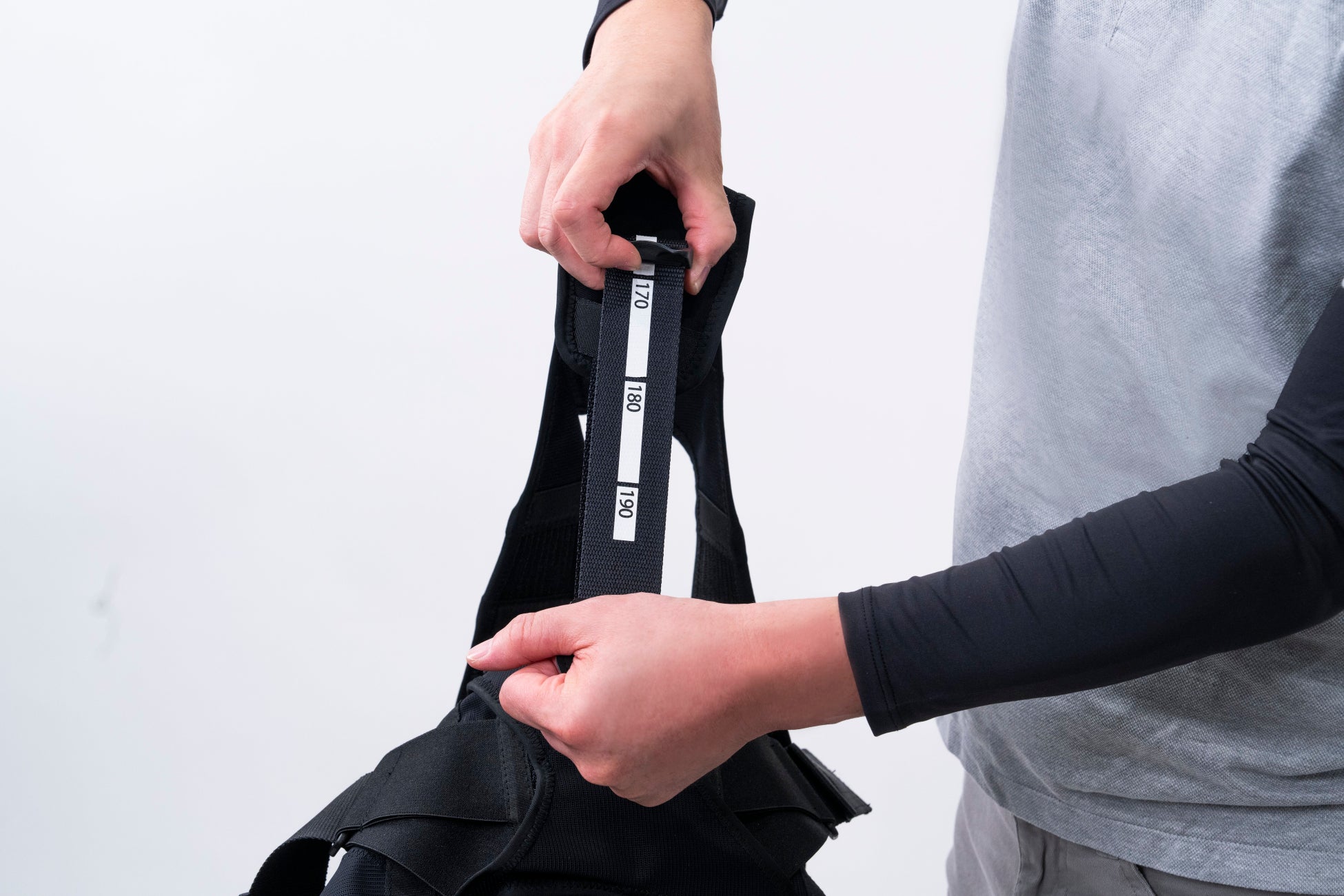 サイズ調節テープにより身長150~190cmまで、どのサイズでもフィット。