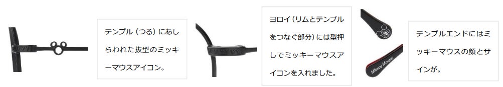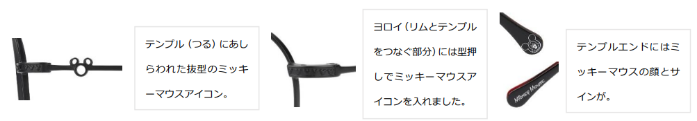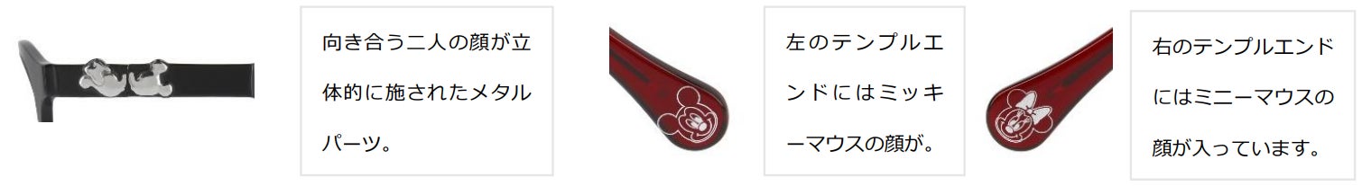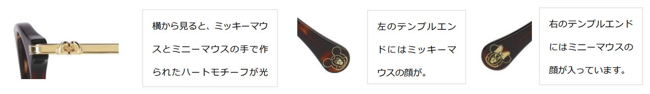テンプル(つる)を広げるとミッキーマウスとミニーマウスの手がハート型を作ってくれます。テンプルエンドには二人のフェイスマークも。