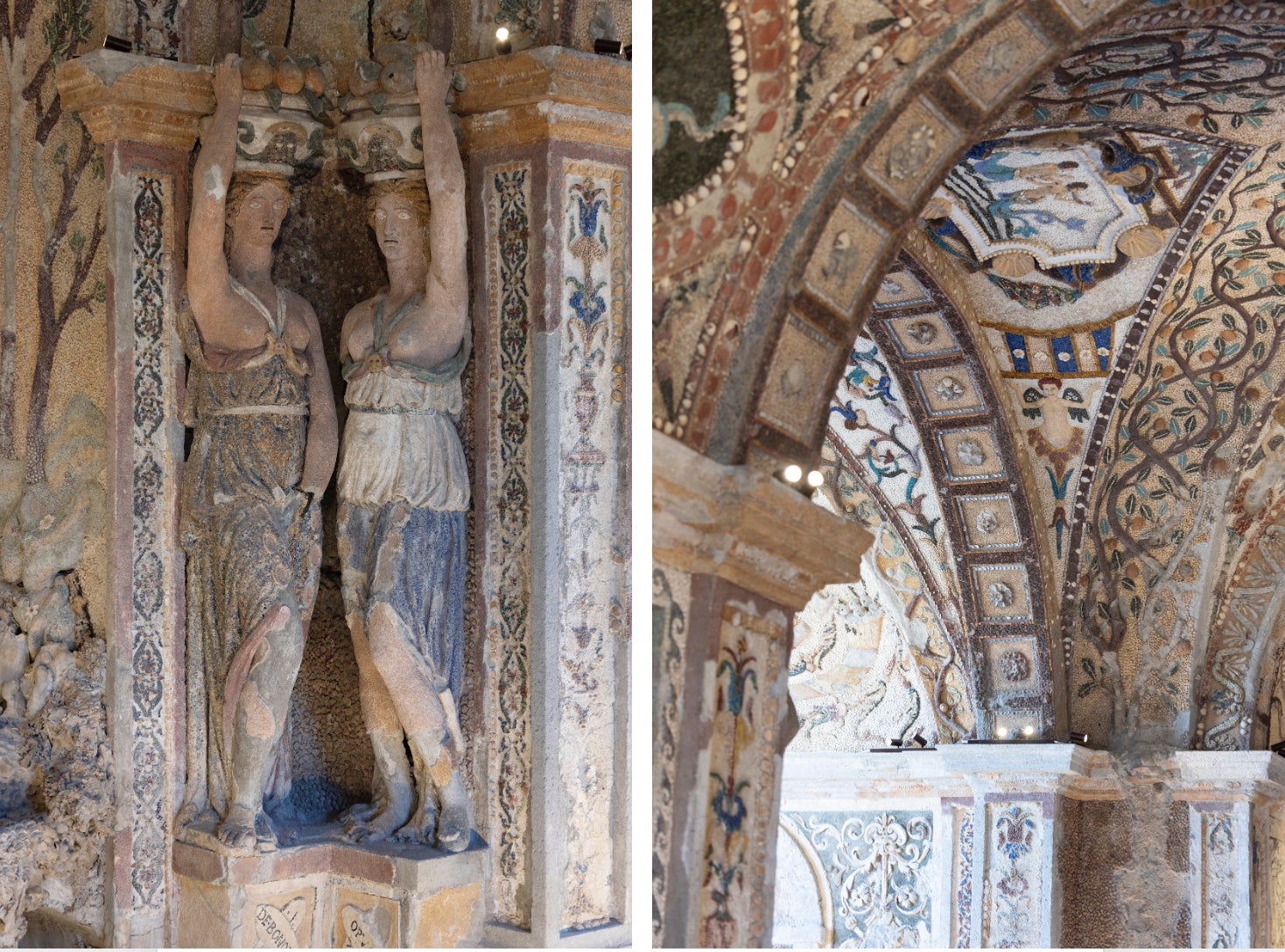洞窟は、貝殻やガラスペースト、半貴石、石の破片、ミネラルクラストを用いたマルチカラー、マルチ素材の巨大なモザイクで全体が覆われているなど、素朴でありがならも豊かで精巧な装飾が施されています。さまざまな素材を組み合わせることで、光の効果が高まり、色調の変化が可能になり、表面に奥行きと躍動感がもたらされています。