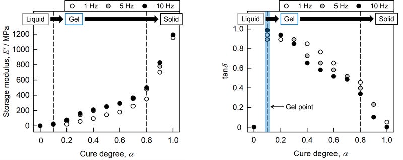 UV硬化樹脂が、UV照射により液体→ゲル→固体へ遷移する過程の材料挙動を把握することができた。