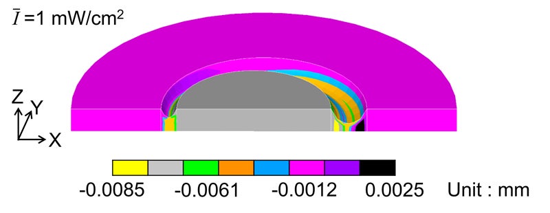 しかしマイクロ接合は、マイクロメートル単位の緻密な精度が要求されるだけでなく、接着剤の硬化収縮による部品の微小位置ずれや変形が製品の機能劣化を招く可能性も指摘されています。そこで、UV接着剤がどのように硬化し収縮するかを、部品の設計時に予測できるような技術が求められていました。