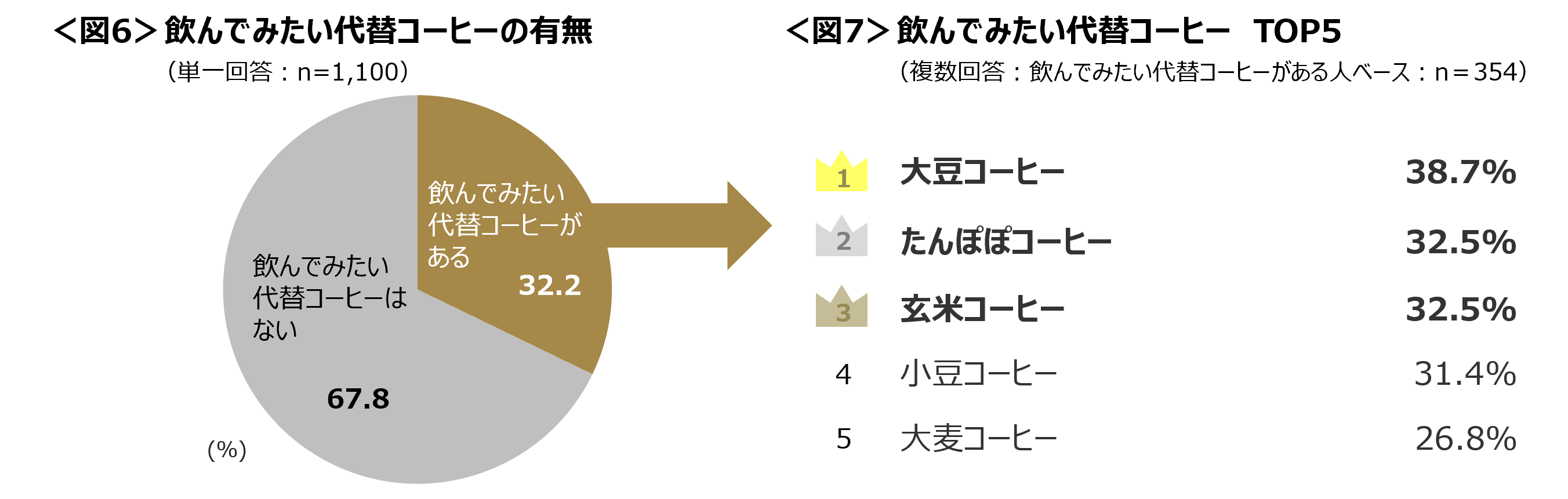 飲んでみたい代替コーヒーがある人は32.2%。飲んでみたい代替コーヒーとしては「大豆コーヒー」「たんぽぽコーヒー」「玄米コーヒー」などが上位にあげられた。 <図6、7>