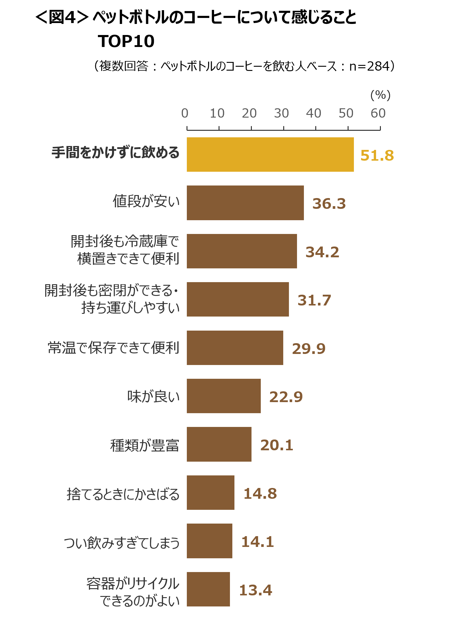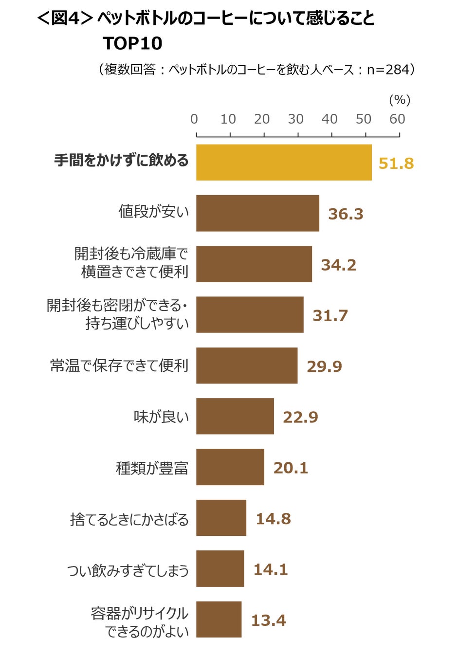 ペットボトルのコーヒーについて感じることは、「手間をかけずに飲める」が51.8%と半数超え。そのほか「値段が安い」や、「開封後も冷蔵庫で横置きできて便利」「開封後も密閉ができる・持ち運びしやすい」が上位にあがる。 <図4>