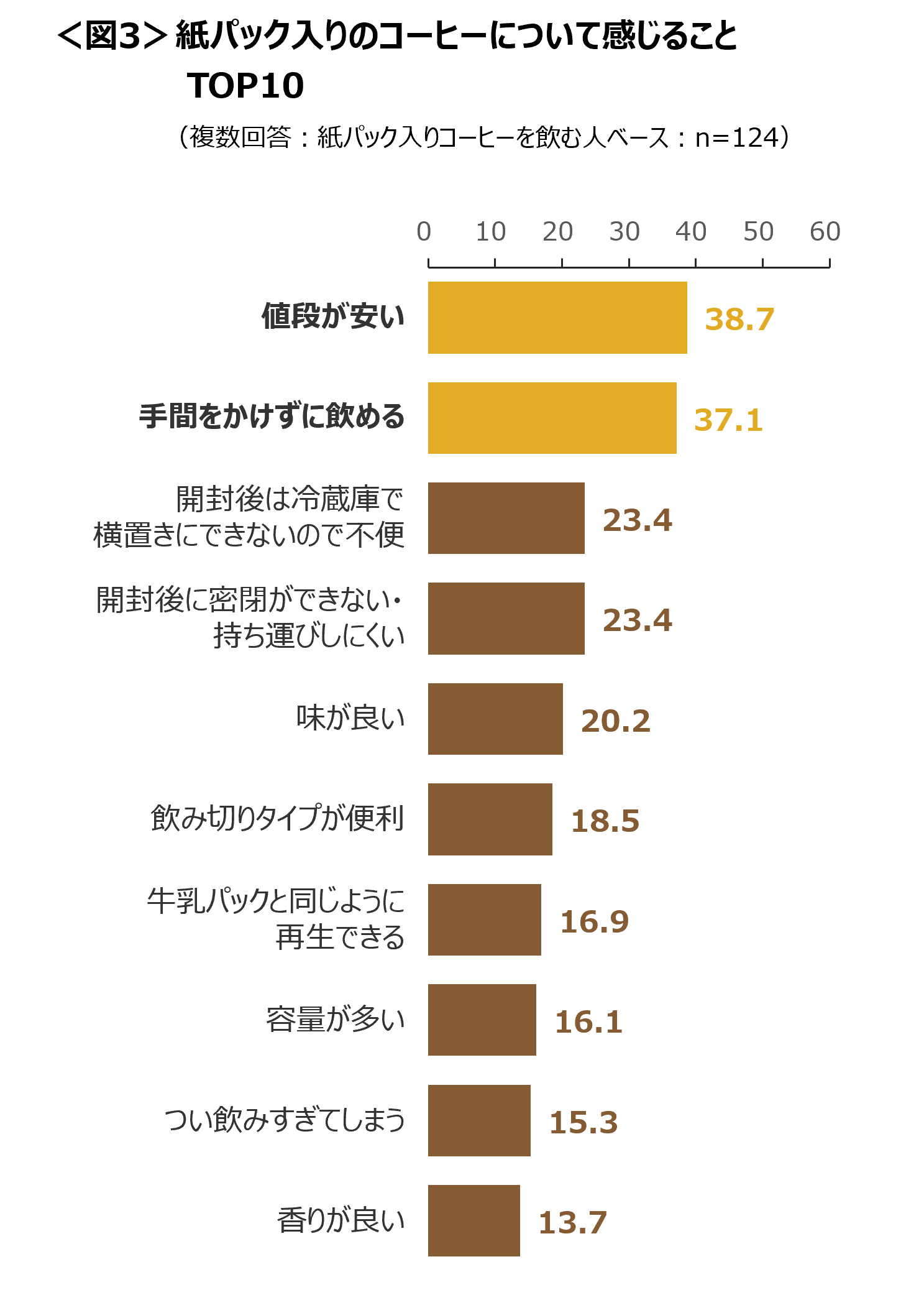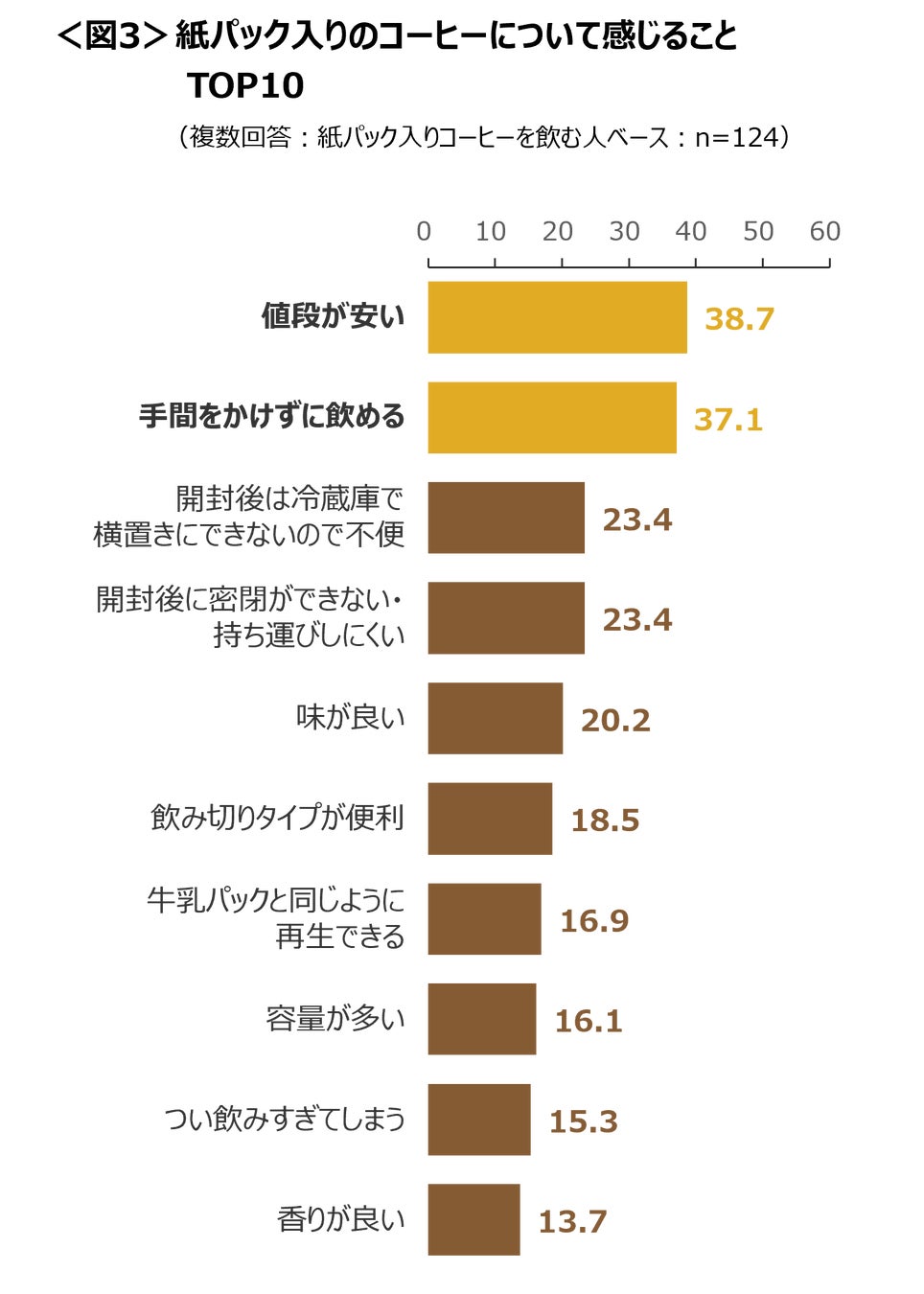 紙パック入りのコーヒーについて感じることは、「値段が安い」「手間をかけずに飲める」がTOP2。次いで「開封後は冷蔵庫で横置きにできないので不便」「開封後に密閉ができない・持ち運びしにくい」といったネガティブな意見が続く。<図3>