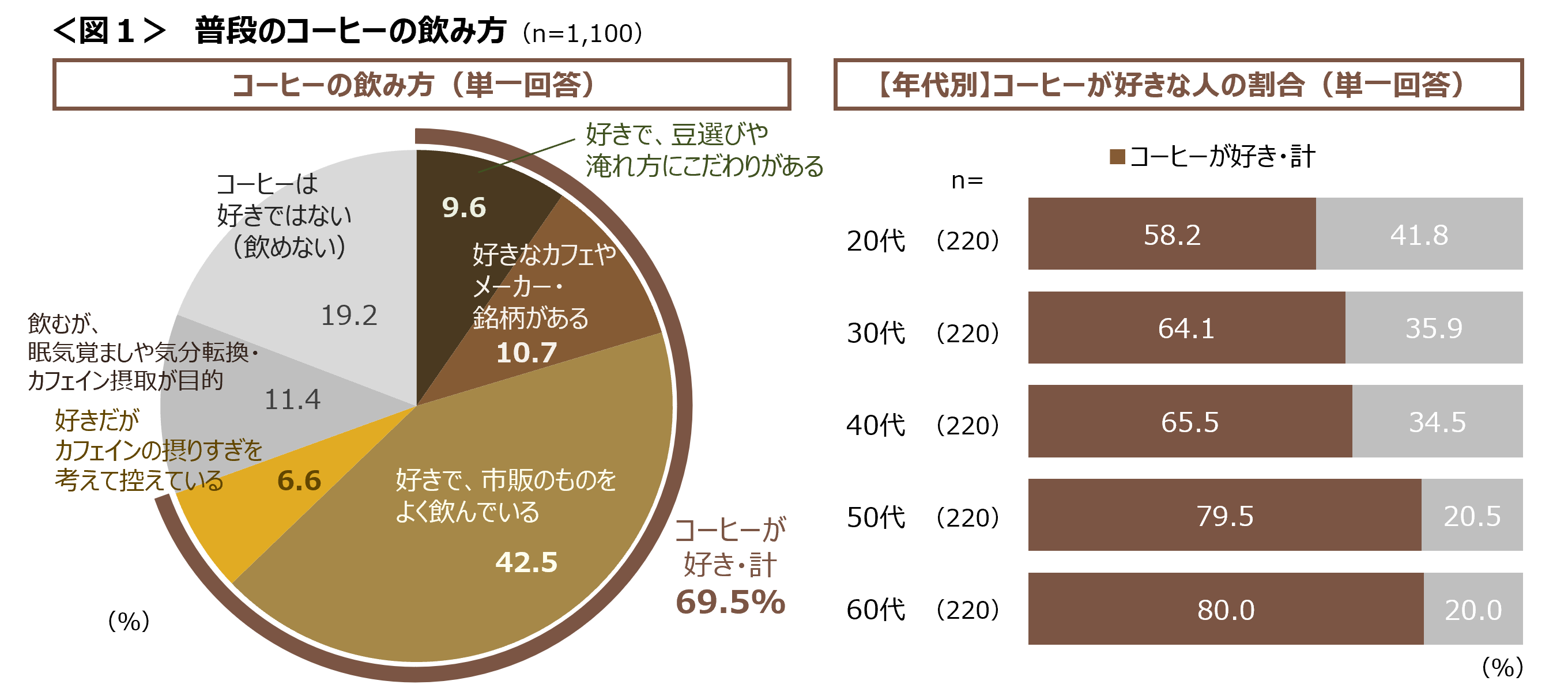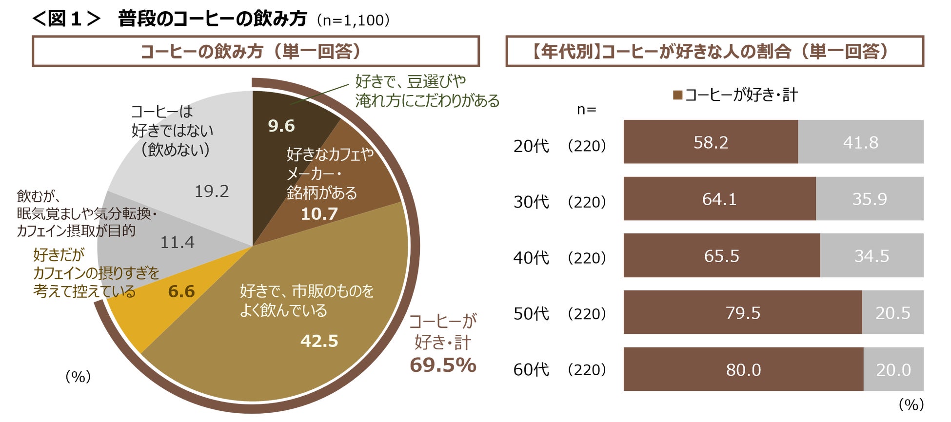 コーヒー好きの割合は若年層ほど低く、60代が8割なのに対し20代では6割弱にとどまる。<図1>