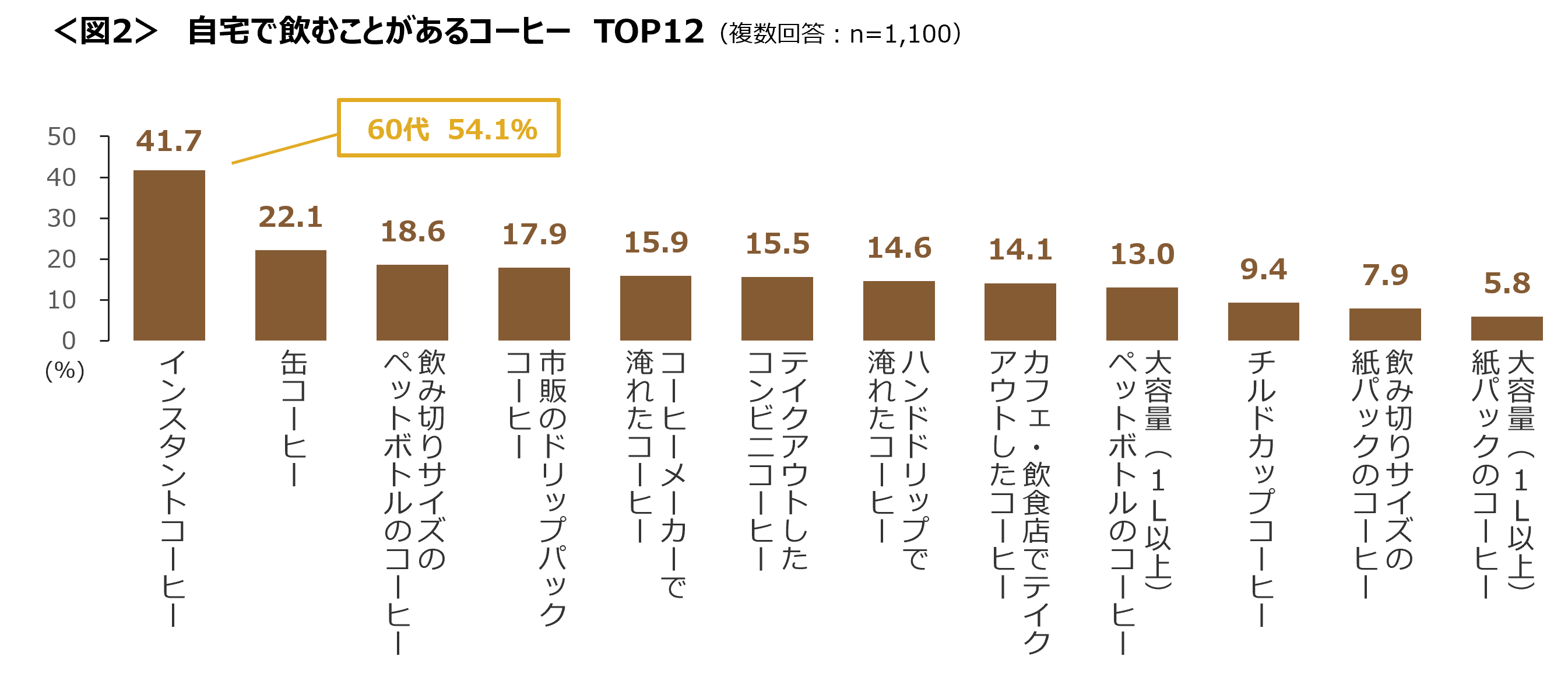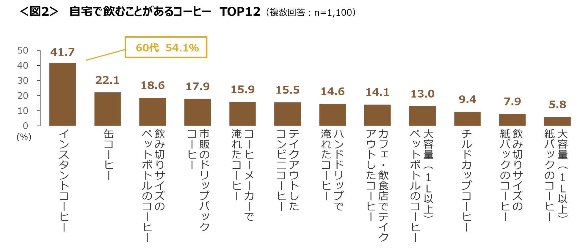 「インスタントコーヒー」は特に高年齢層で飲まれており、60代では54.1%と高い。<図2>