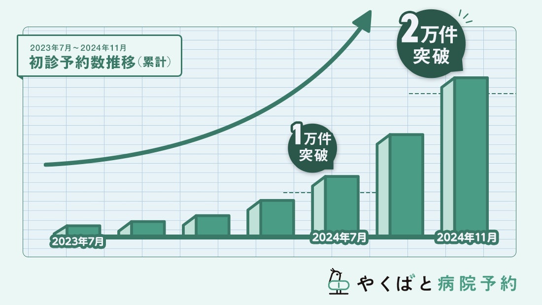その結果、「やくばと病院予約」開始から1年が経過した2024年7月には初診予約数の累計が1万件を突破。さらに、今回、1万件突破に要した時間を大きく上回る4か月という短期間で2万件を突破いたしました。
