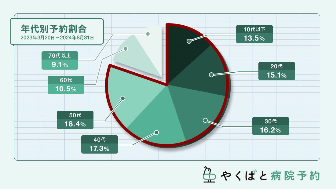 実際に「やくばと病院予約」を通じた予約のうち、約5割が一般的な病院の営業時間外である17時~9時の間となっています。また、予約患者全体の年代を見ても、約8割が50代以下の就業世代で占めており、病院の営業時間中に電話をすることが難しい就業世代を中心に、受診機会の拡大が進むことが期待されています。