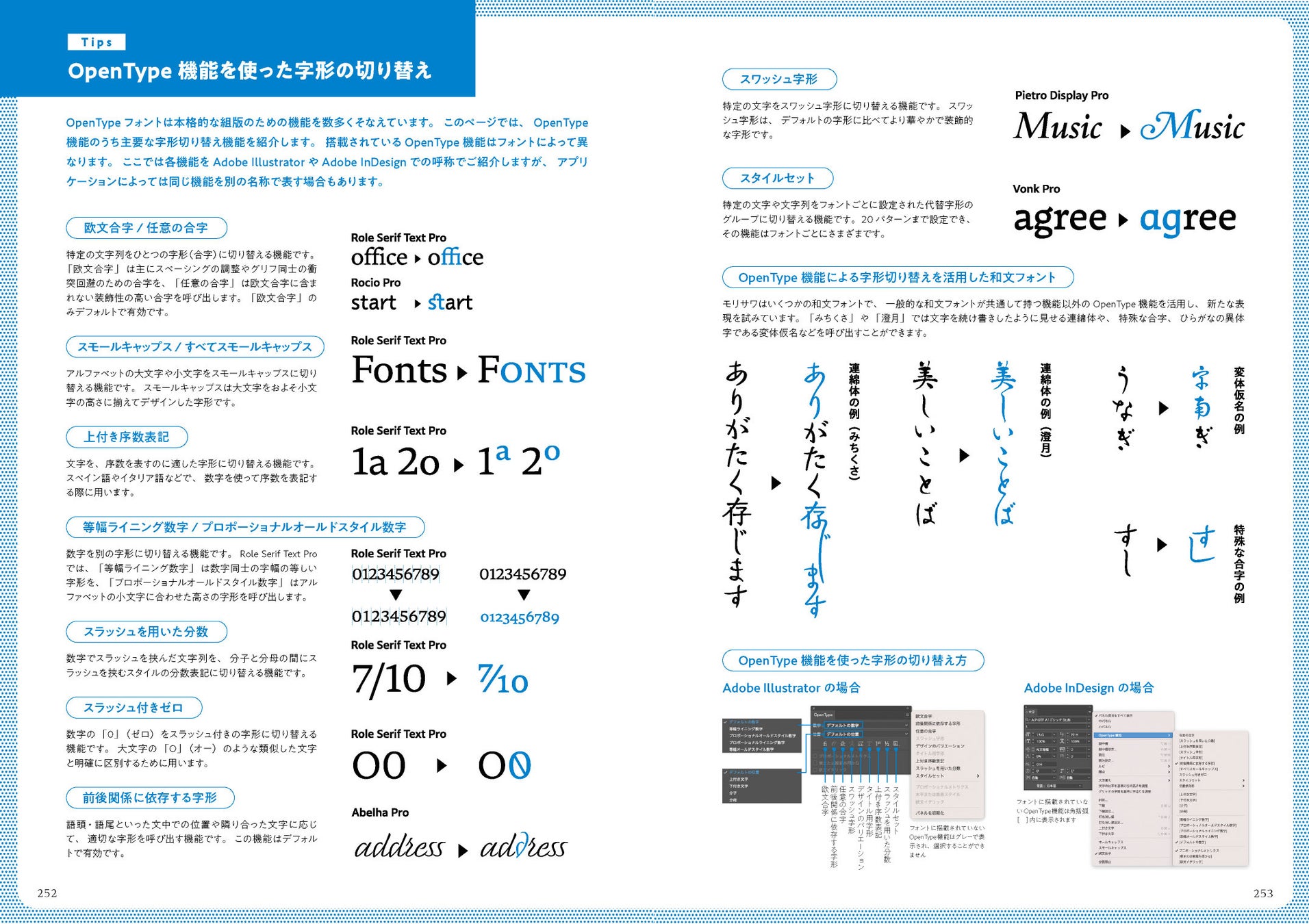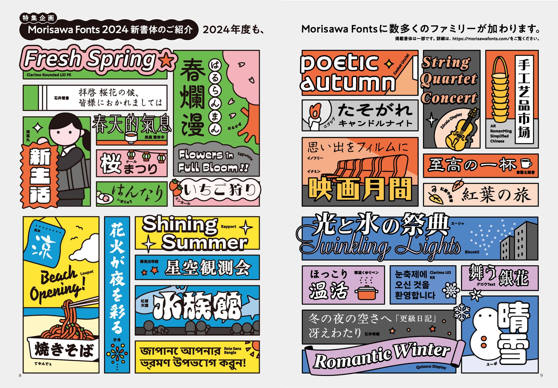 特集企画では、大幅追加となった2024年度新書体の一部を使用して、四季それぞれのシーンをフォントで表現したグラフィック作例を掲載。個性的な新書体たちの雰囲気を味わいながら、デザイン制作のヒントにしていただけます。また、Morisawa Fontsの便利な使い方やUD(ユニバーサルデザイン)書体の解説、文字セットといった基本情報のほか、OpenType機能を使った字形の切り替え、カーニング設定など、役立つTips記事も掲載しています。