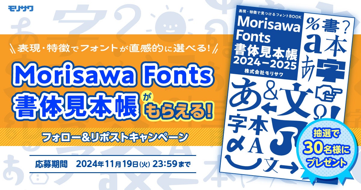 この「Morisawa Fonts書体見本帳2024–2025」の完成を記念して、応募期間中、モリサワ公式X(旧Twitter)をフォローし、対象のキャンペーン投稿をリポストしていただいた方の中から抽選で30名様にプレゼントします。皆様のご応募をお待ちしています。