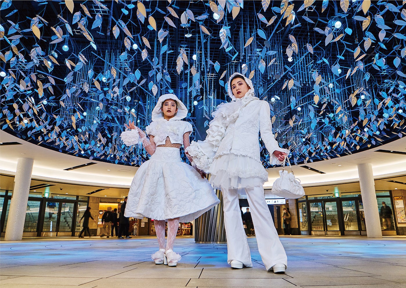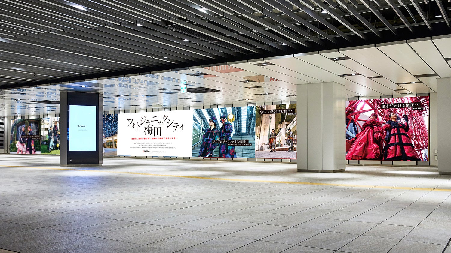 大阪モード学園ファッションデザイン学科 高度専門士コース・ファッションデザイン学科・ファッションテクノロジー学科 12 グループの学生が創作した衣装着用モデル(ヘアメイクはヘア・メイクアーティスト学科の学生が担当)を、梅田の各スポットにて撮影し、梅田のアートシーンとして壁面にダイナミックに展開。学生のファッションコンセプトと各スポットの価値を組み合わせた「シーンコンセプト」と併せて表現します。