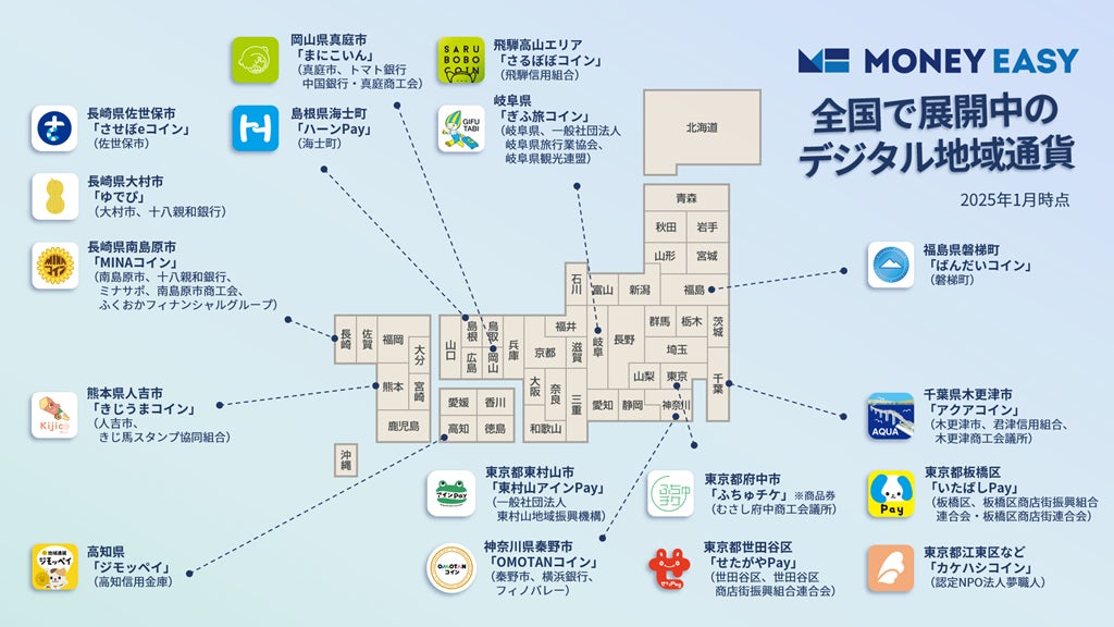 岐阜県飛騨高山地域「さるぼぼコイン」/千葉県木更津市「アクアコイン」/東京都江東区「カケハシコイン」/長崎県南島原市「MINAコイン」/東京都世田谷区「せたがやPay」/岐阜県「ぎふ旅コイン」/熊本県人吉市「きじうまコイン」/福島県磐梯町「ばんだいコイン」/東京都府中市「ふちゅチケ」※商品券/東京都板橋区「いたばしPay」/長崎県佐世保市「させぼeコイン」/岡山県真庭市「まにこいん」/東京都東村山市「東村山アインPay」/長崎県大村市「ゆでぴ」/高知県「ジモッペイ」/神奈川県秦野市「OMOTANコイン」/島根県海士町「ハーンPay」